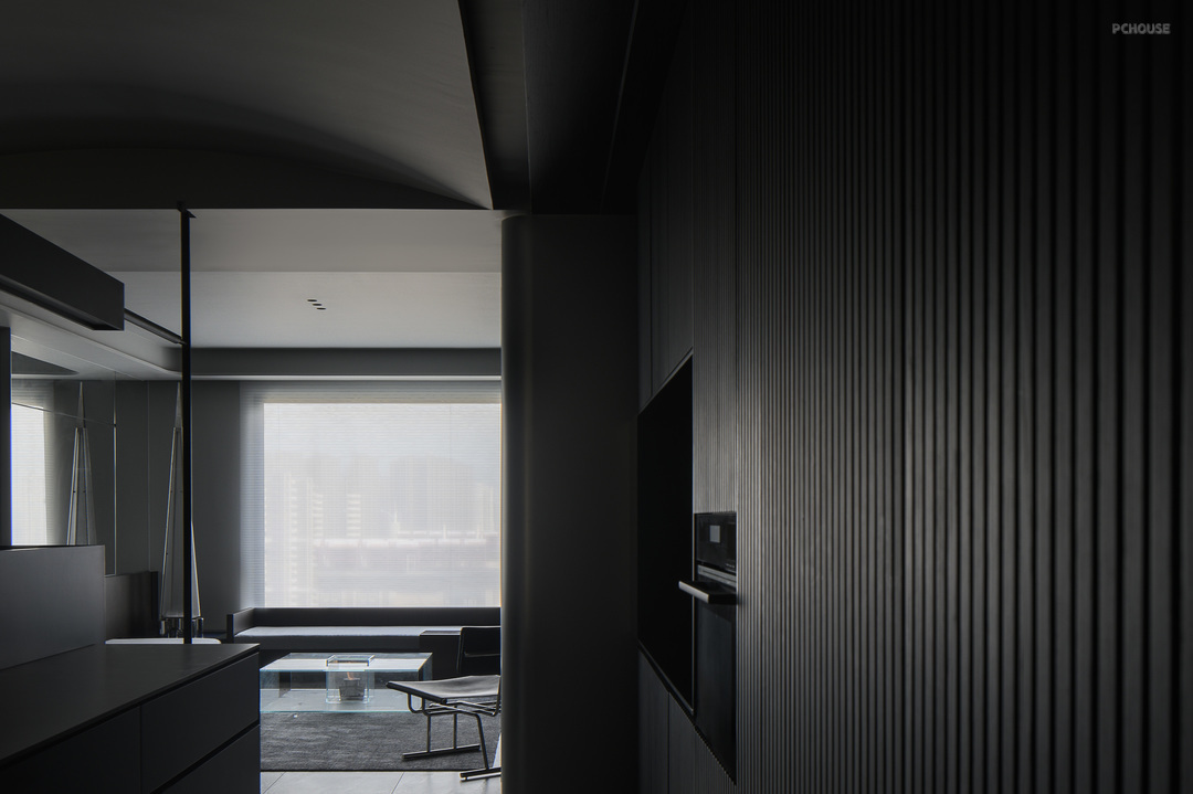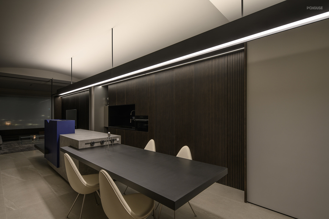 岛台的右侧就是餐桌,整条的黑色线条灯一直从鞋柜处延伸到阳台隔断,照亮整个餐厨区,拉长纵向的视觉感受。
