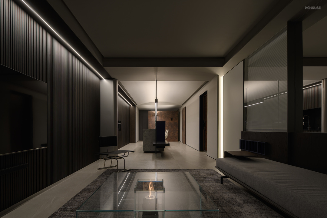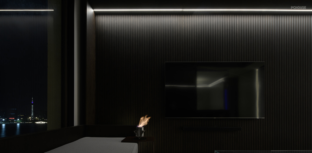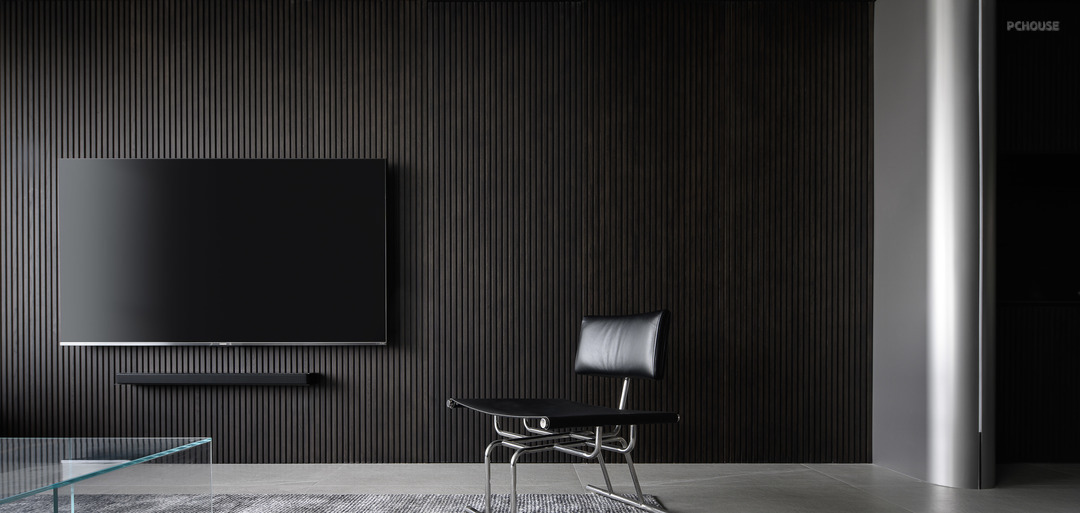 整面的木格栅背景墙一直到客厅电视背景墙,把客卫和主卧的房门也都隐藏其中。