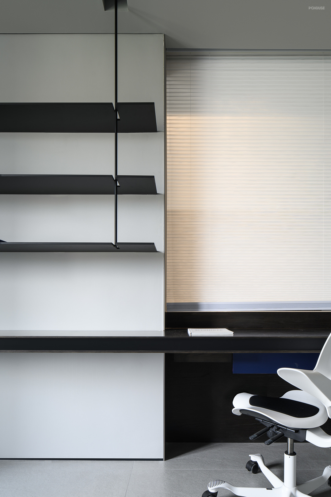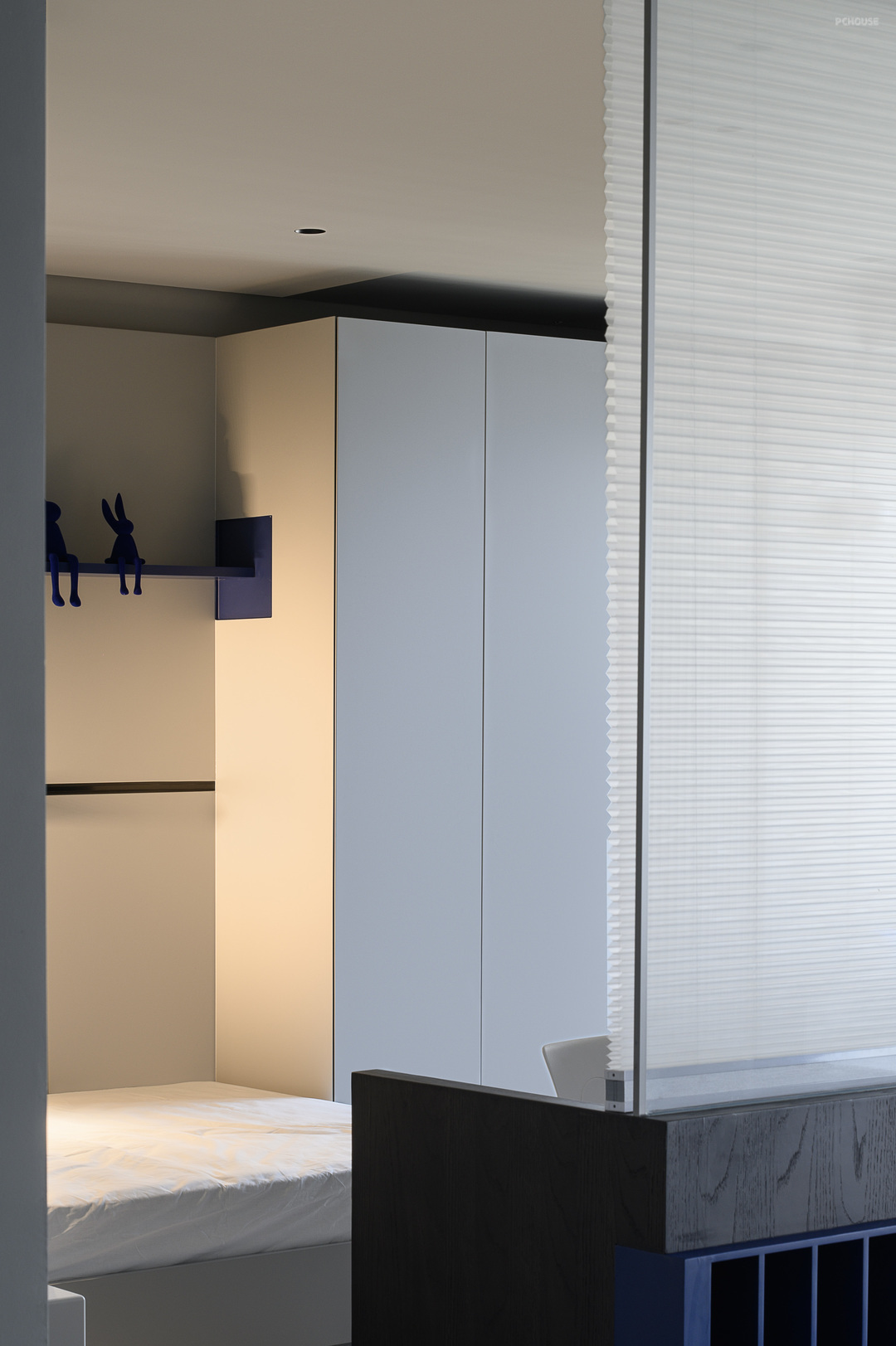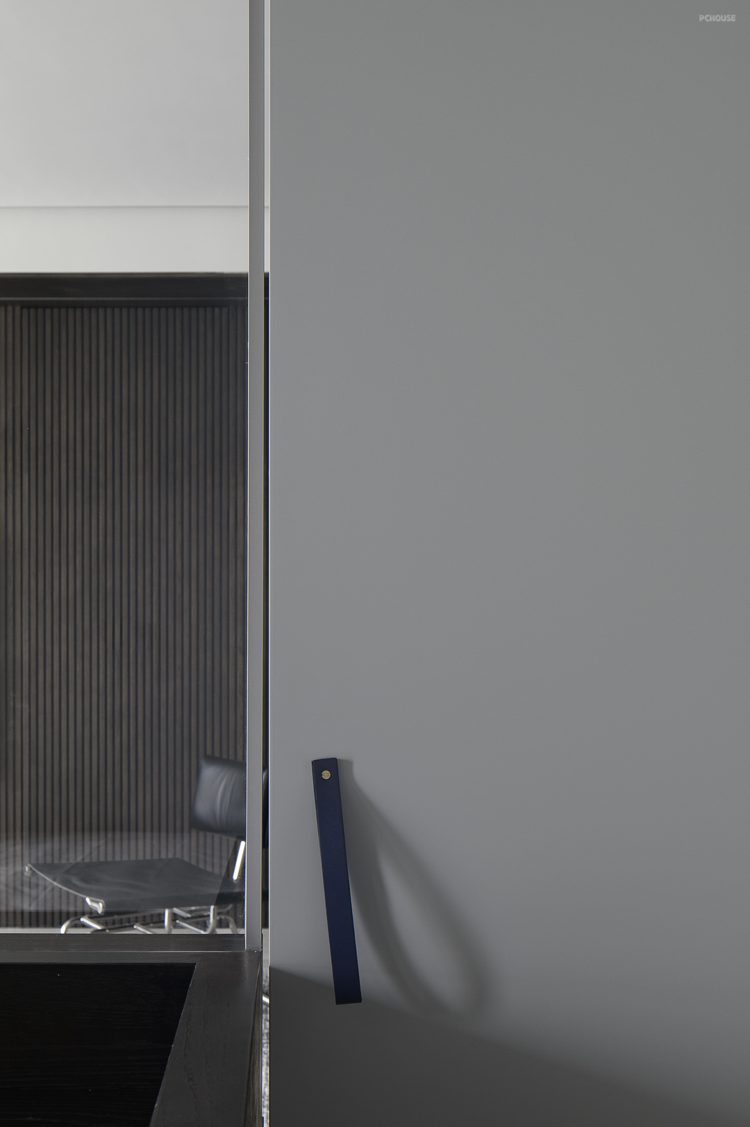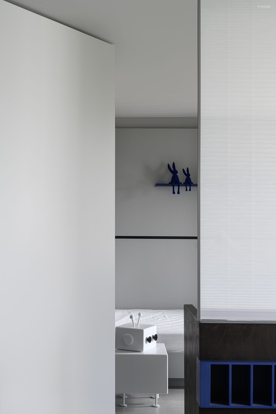 鞋柜的克莱因蓝也在整个黑白灰色调的空间里跳脱出来,成为色彩亮点。