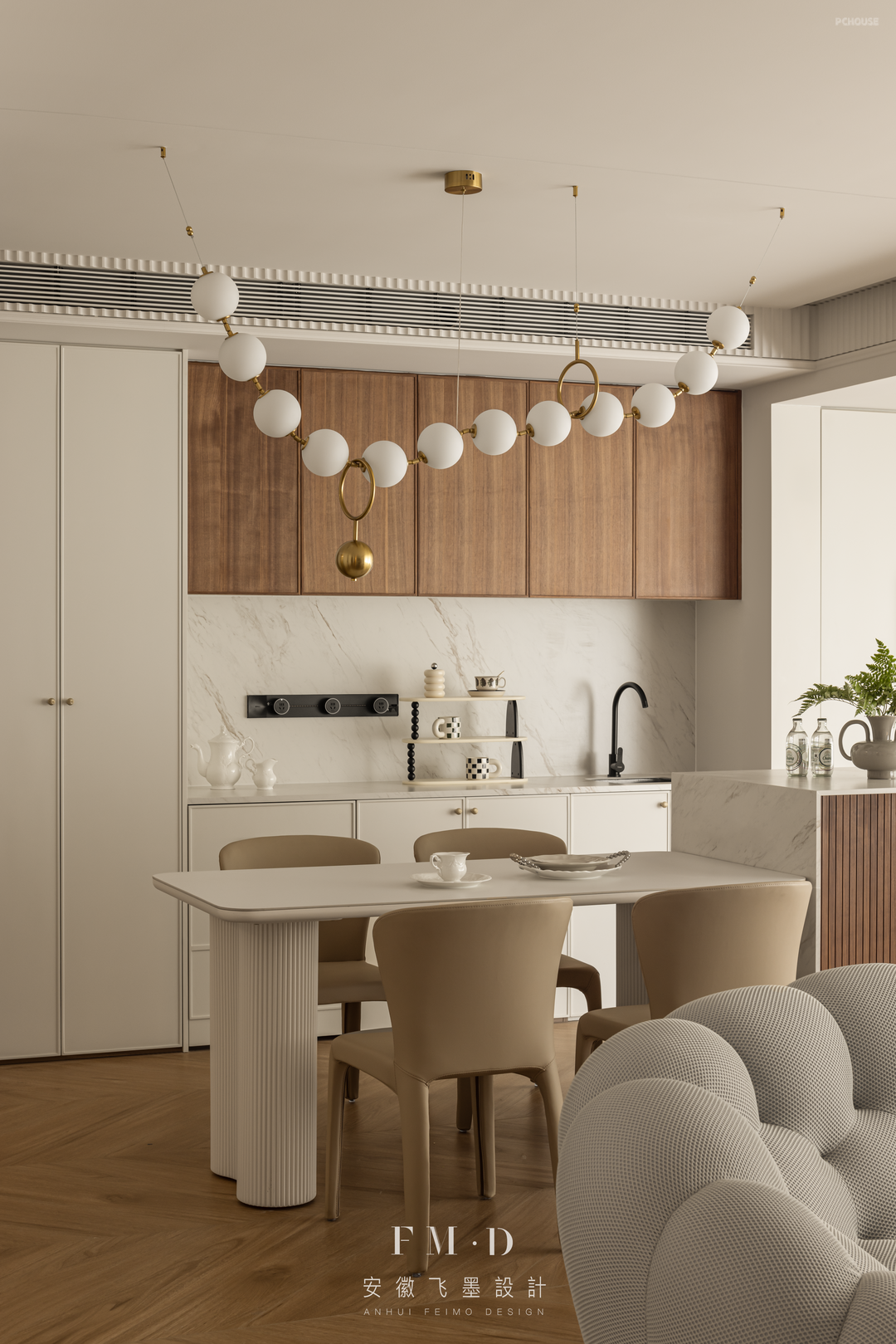 空间以沙发为界,横厅的另一侧,是多功能餐厅;原木、栅格板、大理石,材质的搭配丰满空间的质感,精美珍珠灯串成为空间的点缀。