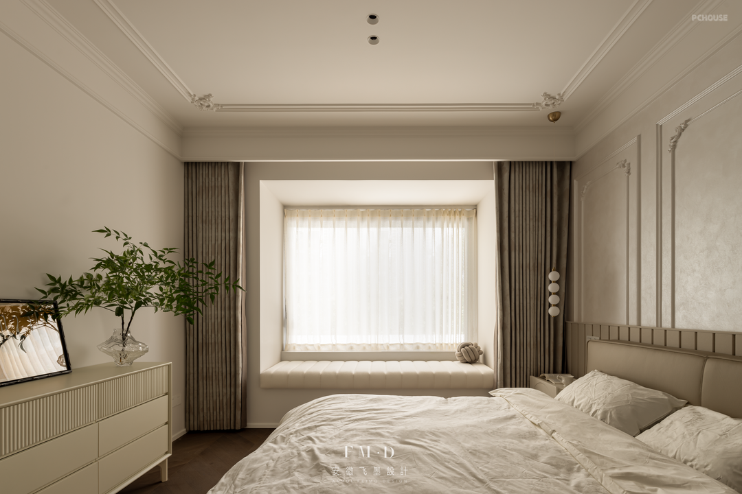 主卧合并北次卧,规划卧室+卫浴+衣帽间的套间设计,提升入住舒适度;保留飘窗,铺上软垫,空间的休闲功能也被兼顾到。