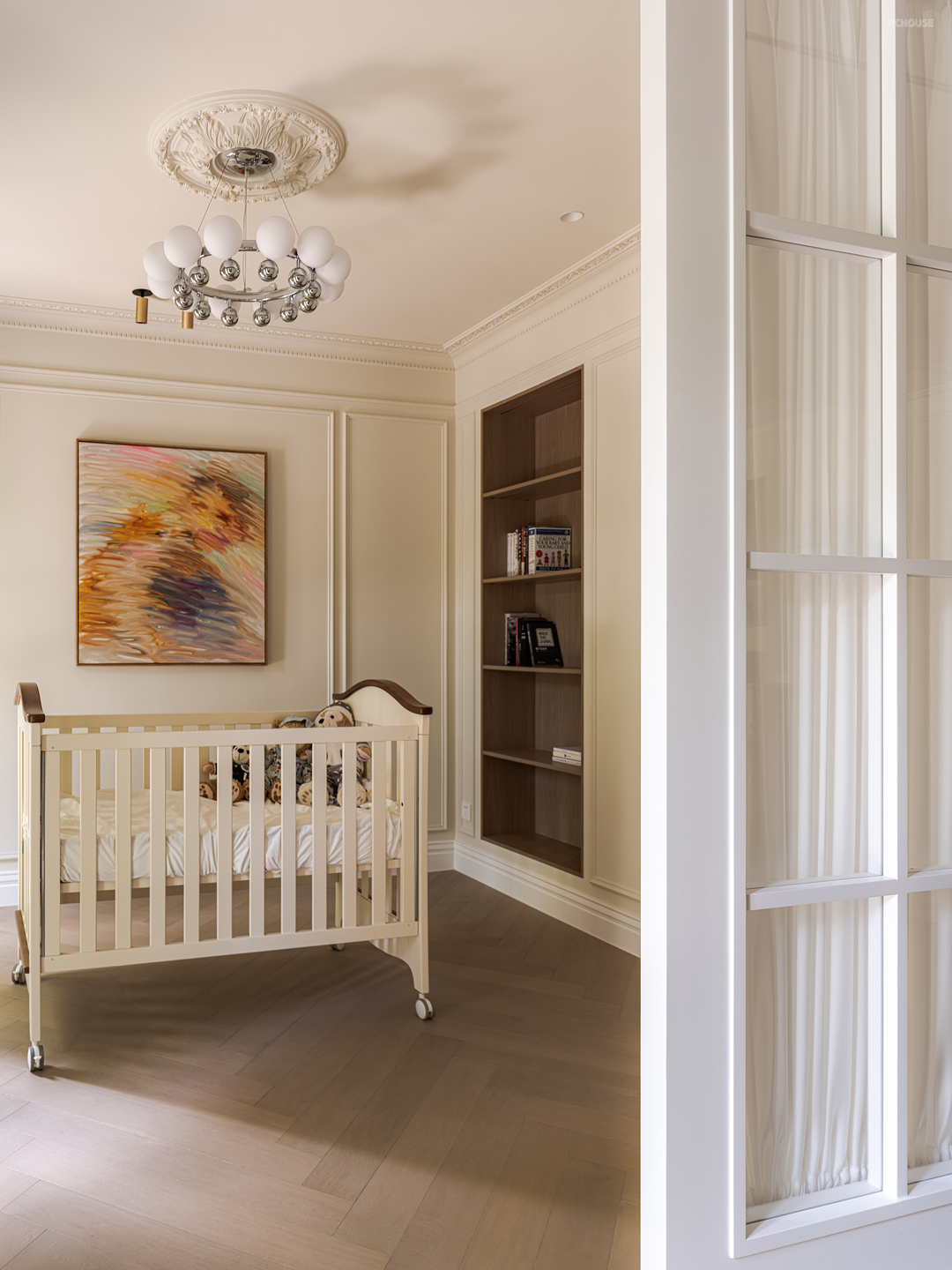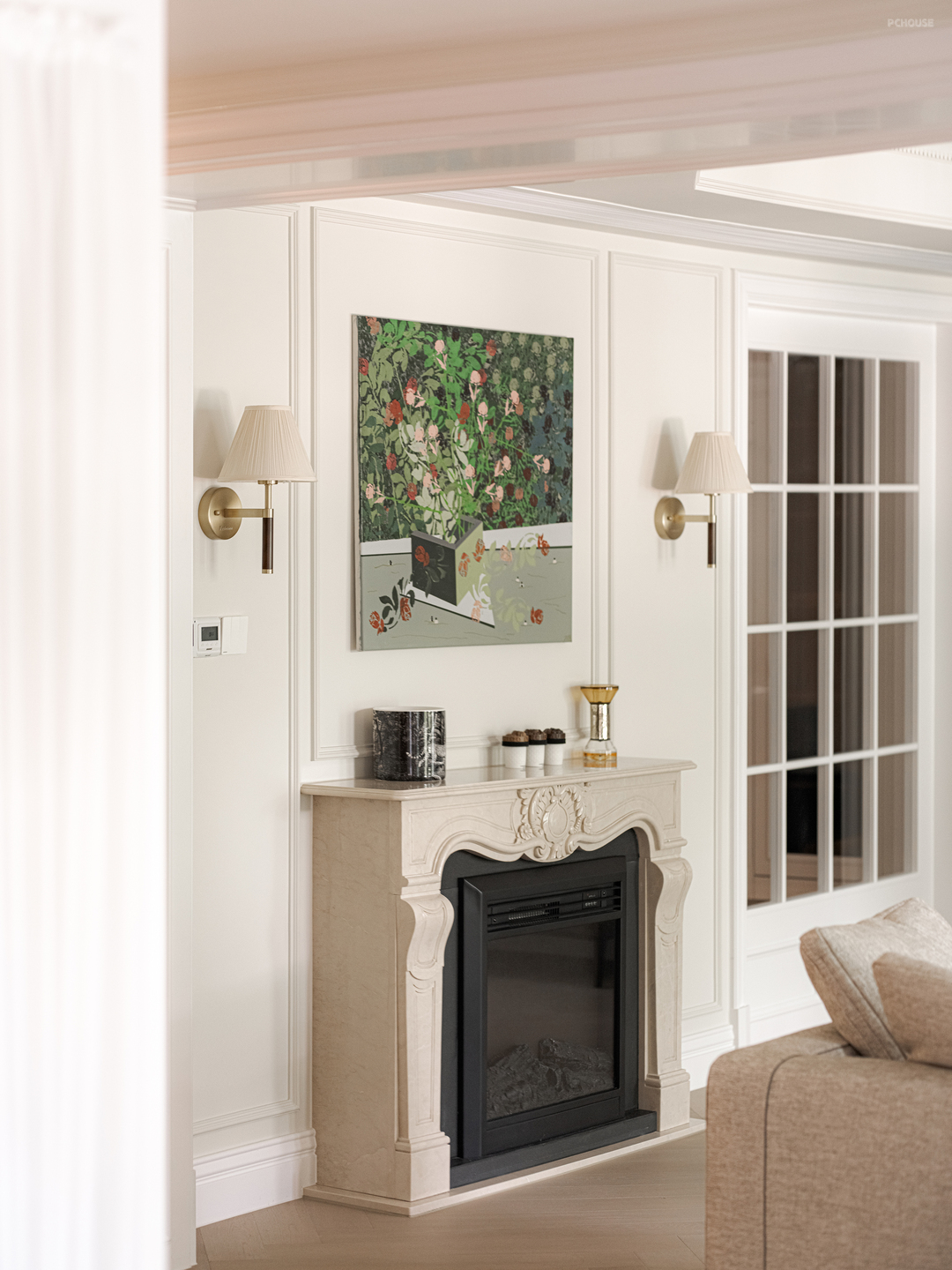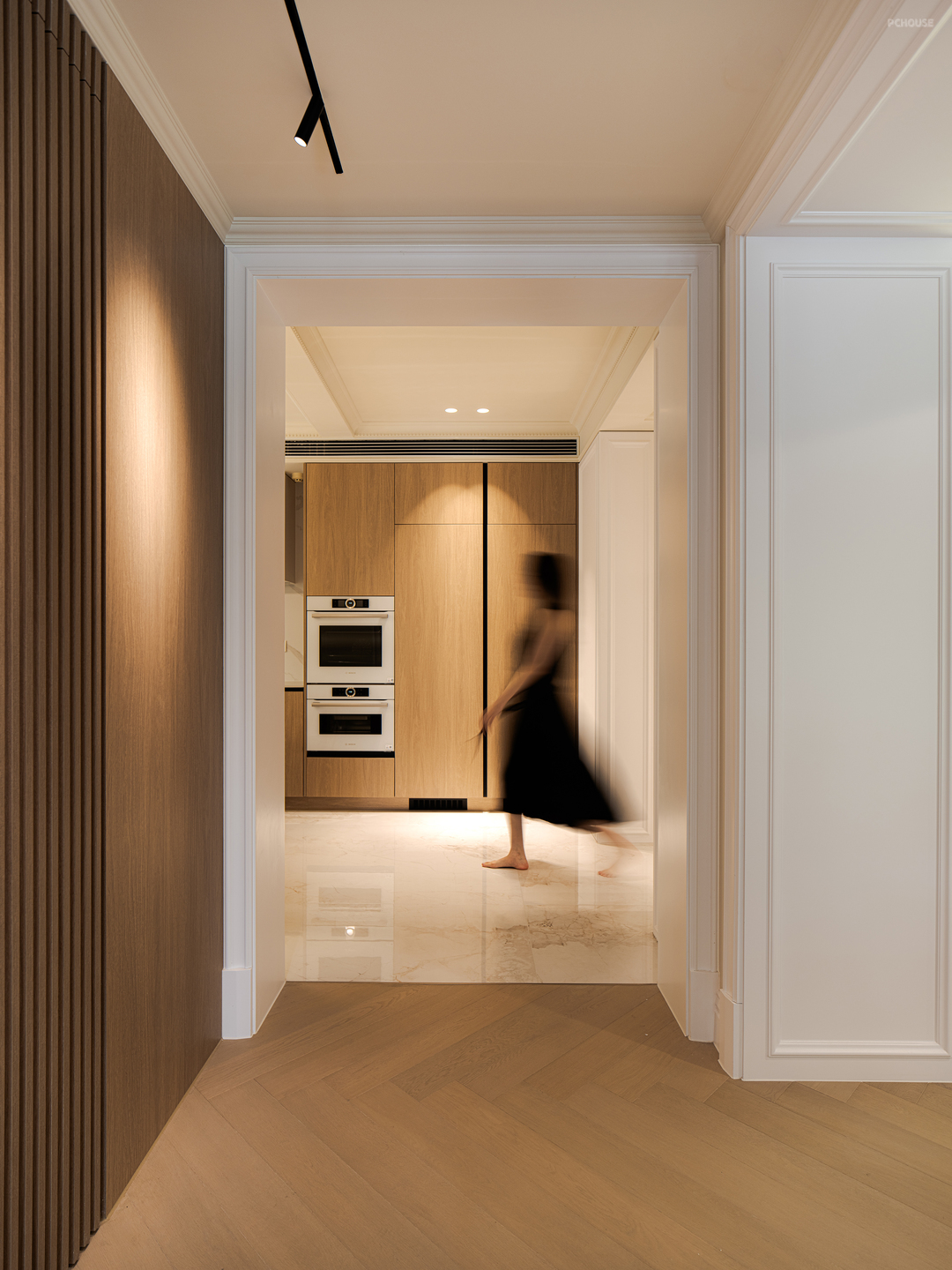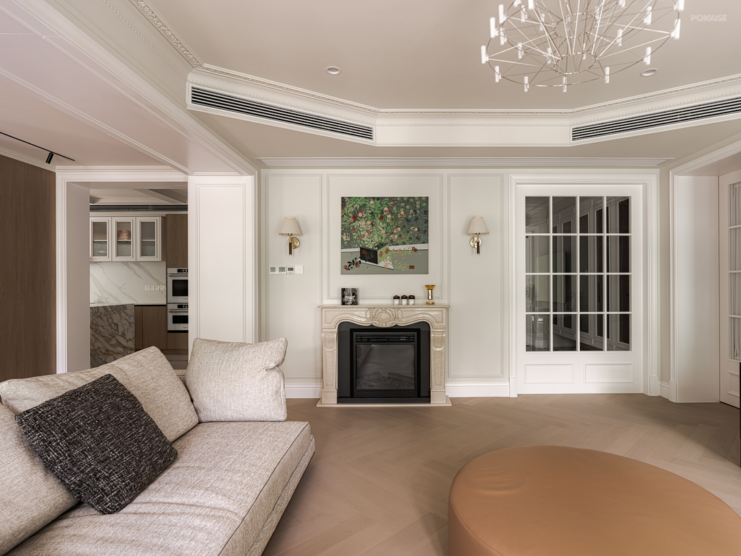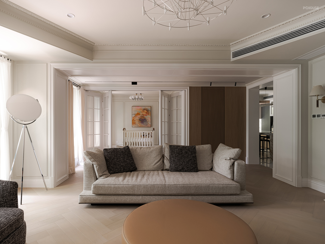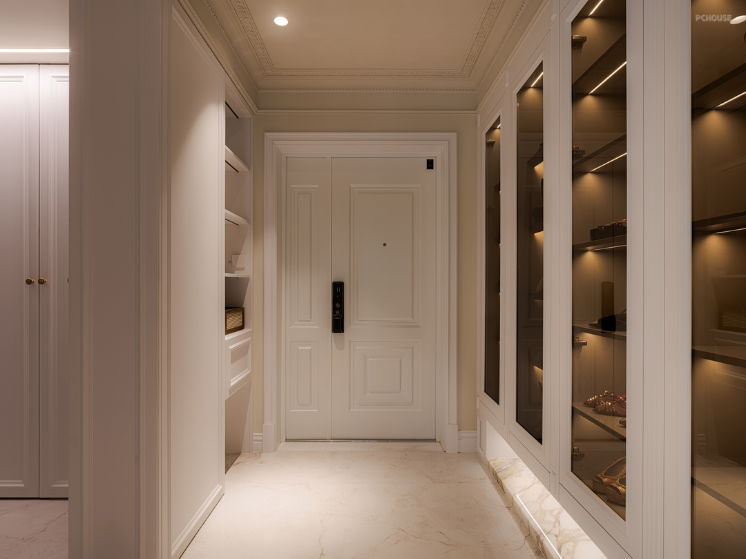 空间转换之间的通道,用了门套包裹的方式化解梁柱结构,让轻法式线条营造高挑的视觉效果。