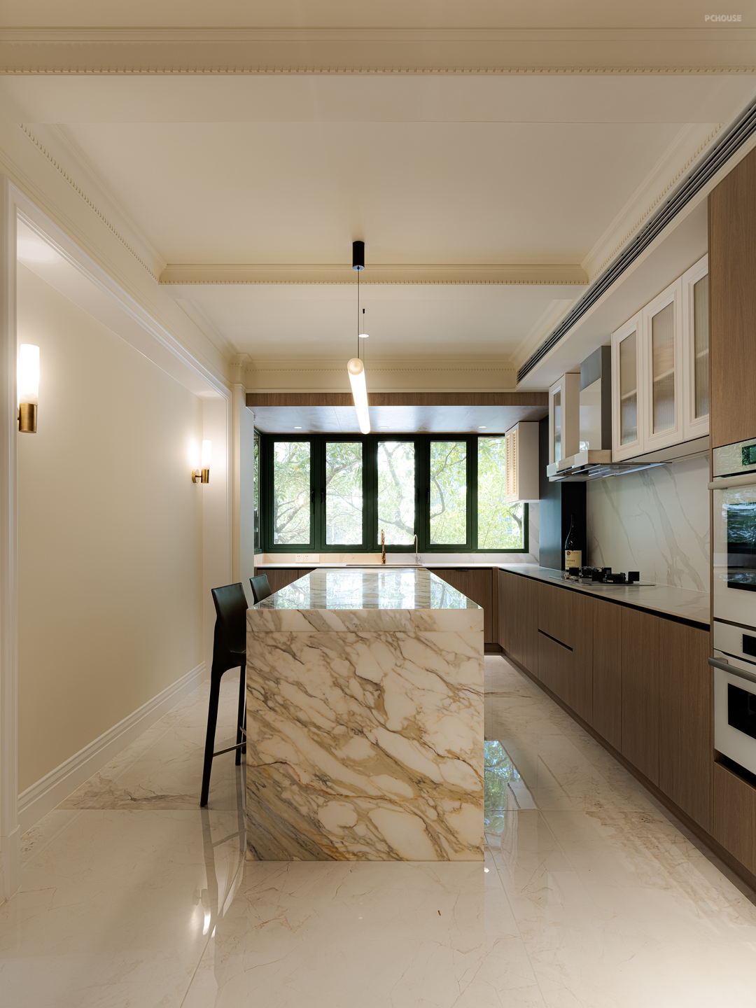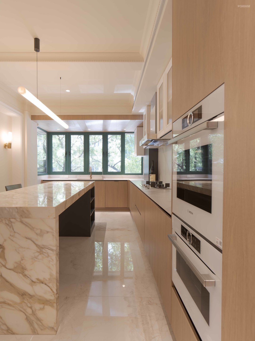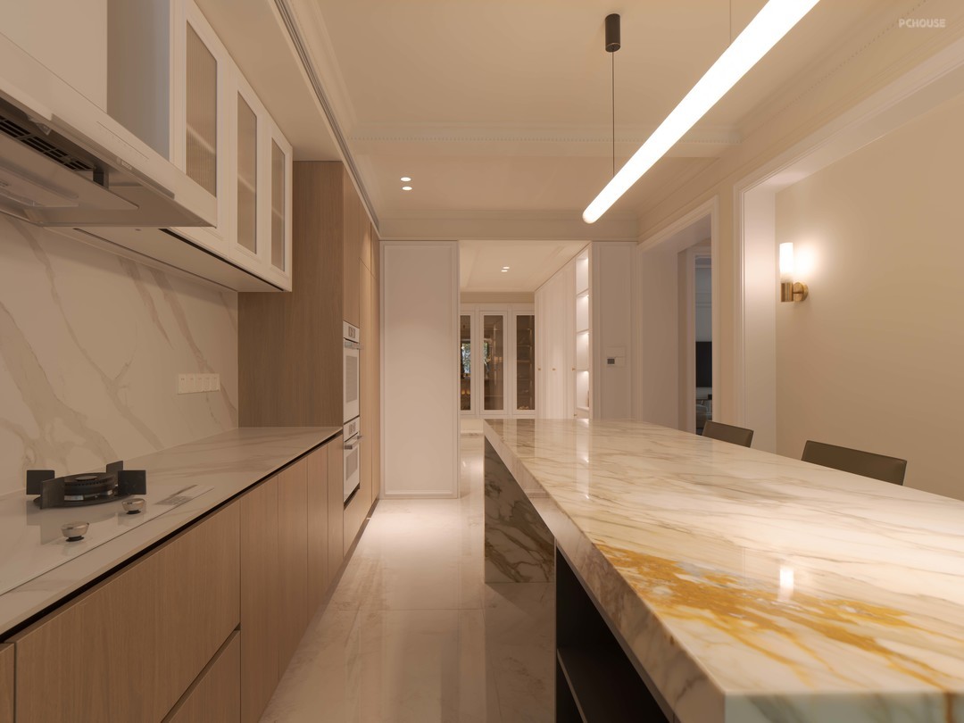 视线延伸,长廊尽头就是开放式餐厨区,西向的梧桐景观映入室内,又是一片绿意映入眼帘。