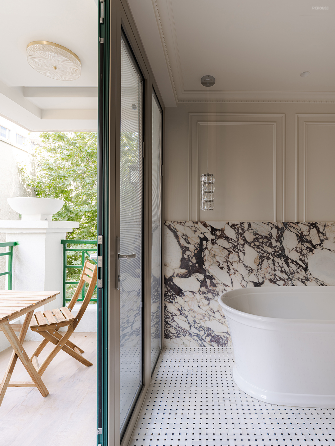 这套案子里,我最喜欢的,就是对主卫的改造,既有室内外的借景融合,亦有新居住体验与老上海风情的呼应,所以放在前面先讲。