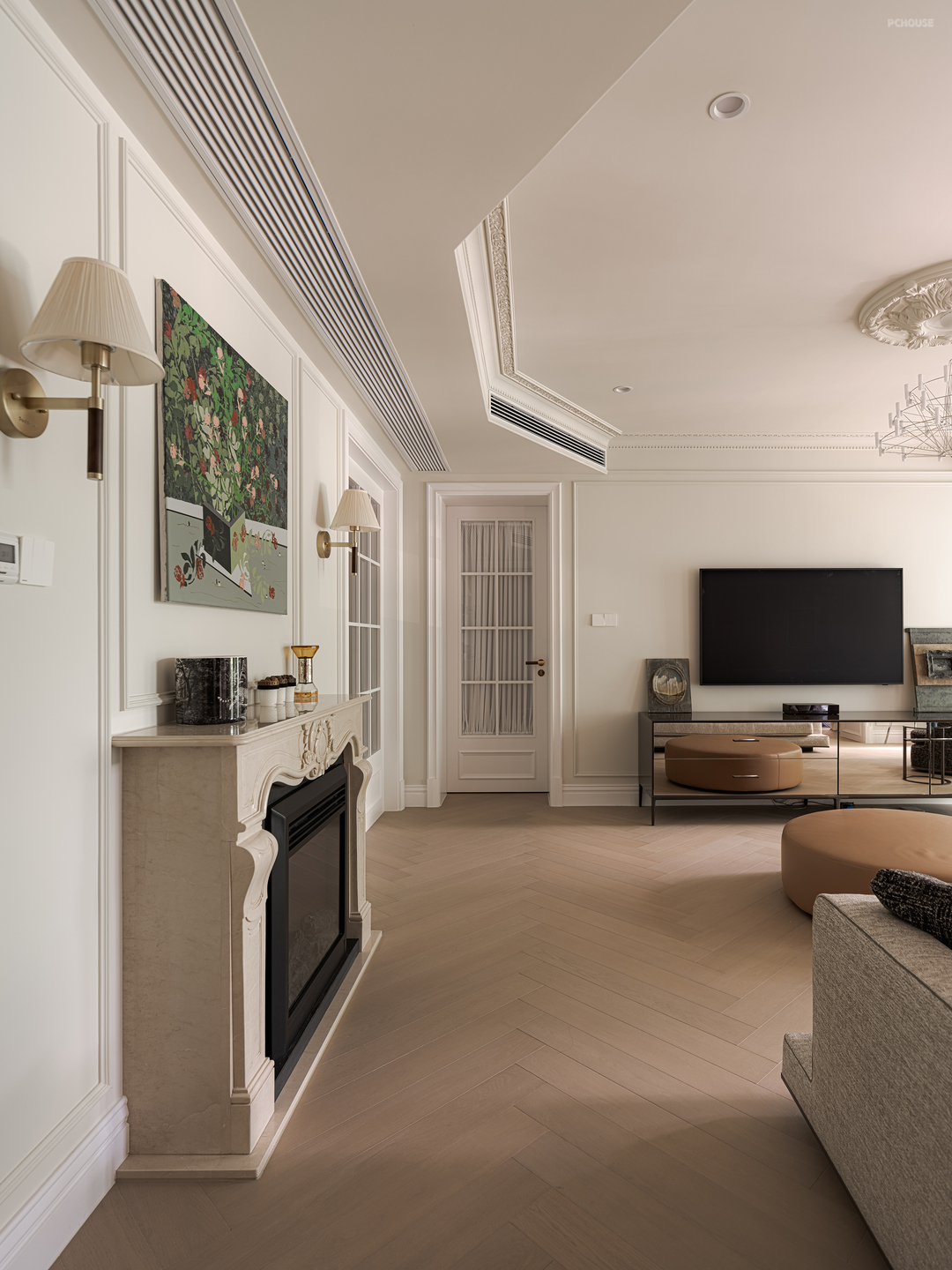拆除完成后,顶面留有两处八字造型不能去掉,于是沿用这个造型,给客厅做了个八字吊顶,更添复古风情。