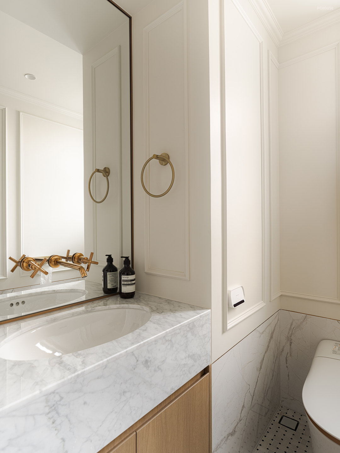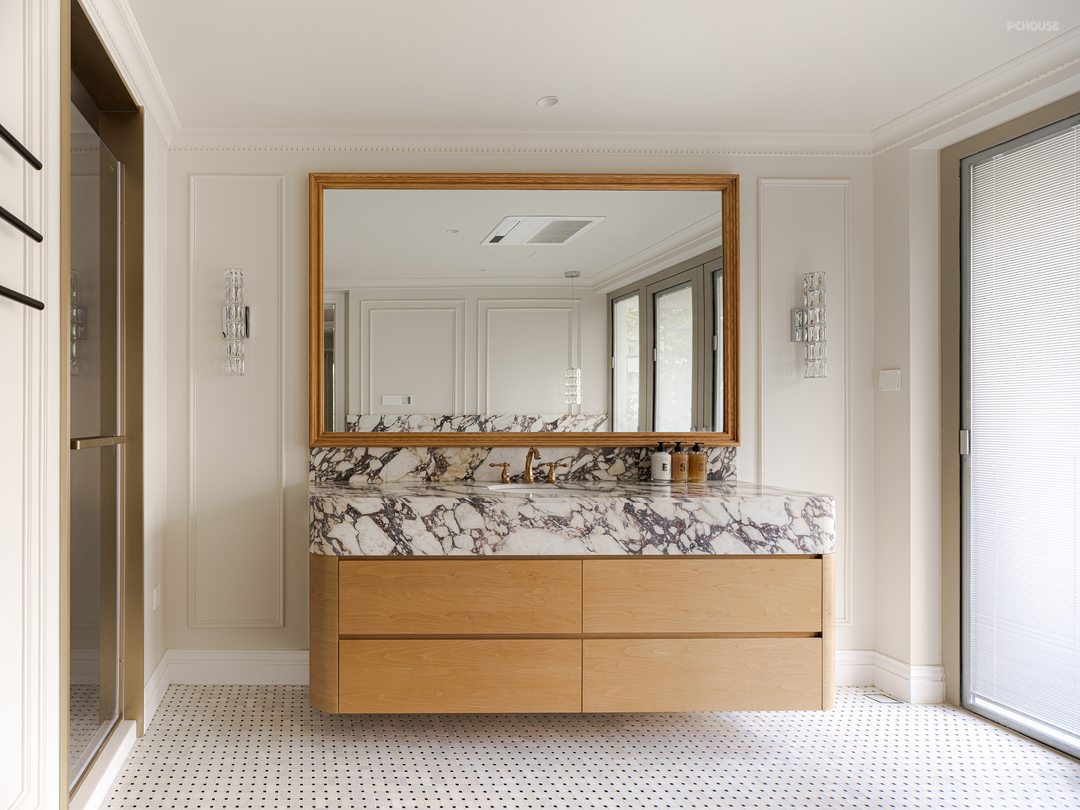 传统卫生间的墙面,通常会用瓷砖或大理石铺设,这里沿用法式石膏线条+防水涂料,营造温暖松弛舒适的感受。