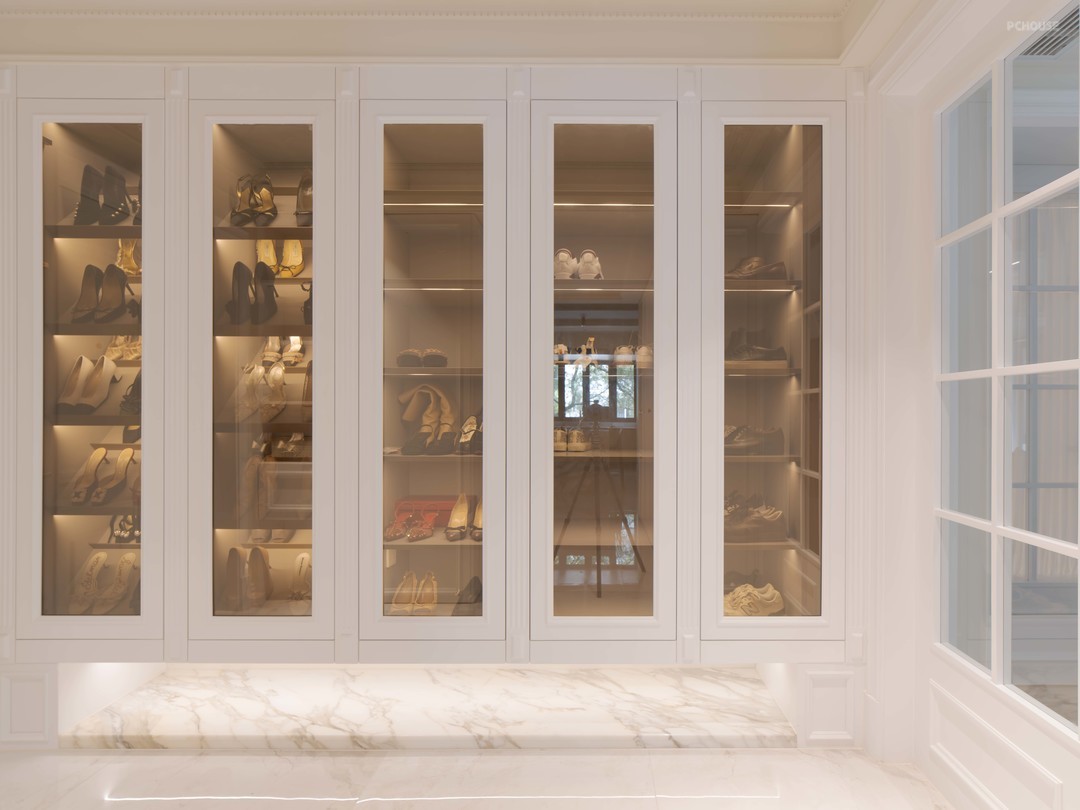 女主人从小生活在国外,本身就读的也是艺术类院校,非常时尚。一组镀膜玻璃玄关柜,收纳了女主人常用的鞋靴包包。平时不开灯的时候,作为镜子,能让女主人出门之前整理仪容,开了灯,就能让人一眼就看清陈列的鞋靴款式,不用打开翻找。
