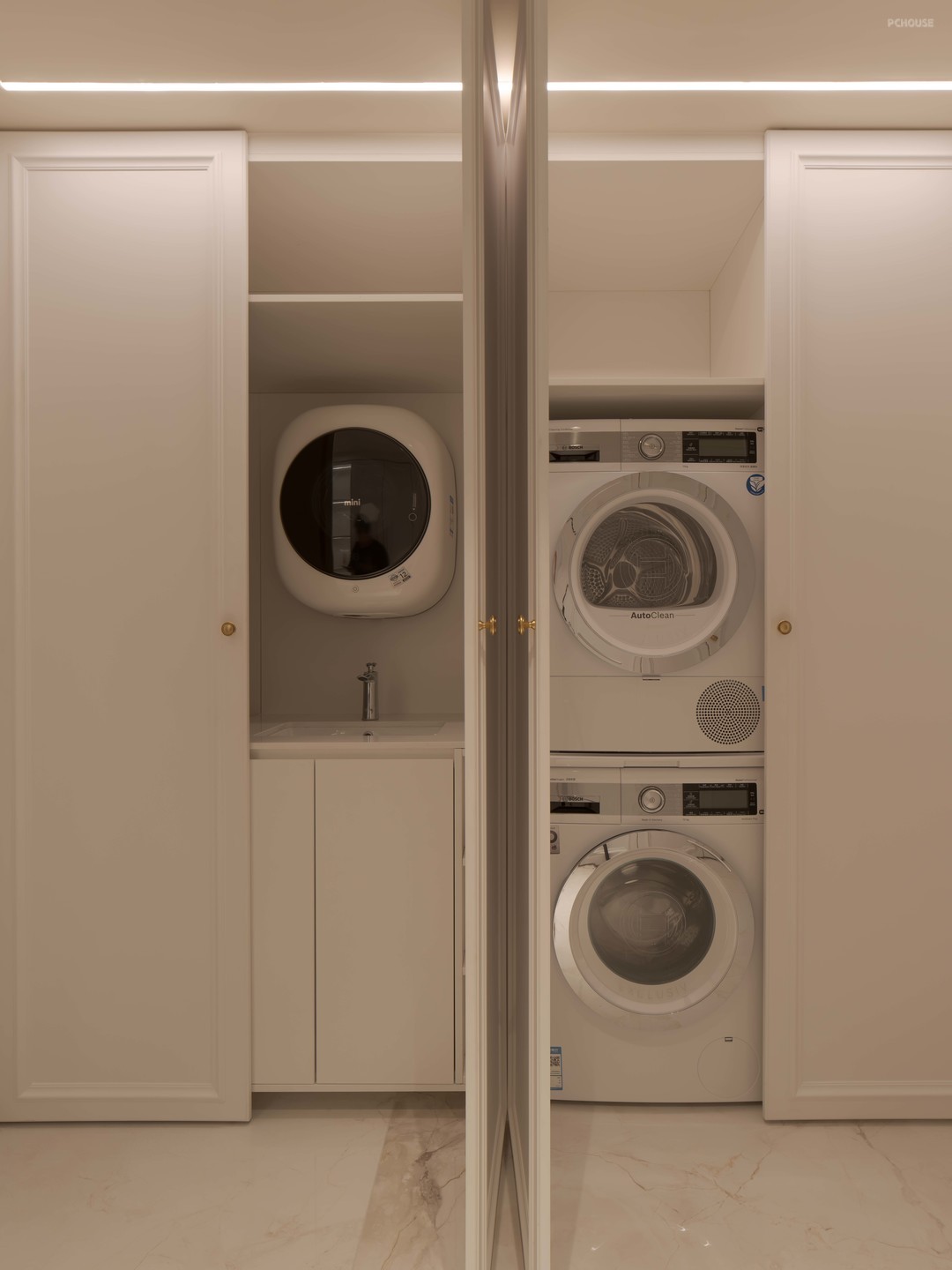 西面长廊,左边是满墙收纳,放置男女主人隔夜的大衣和一些常用杂物,右边则是家政区。