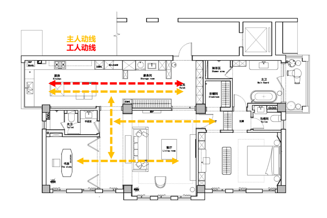 2. 家政间作为一个软性的区域划分,能够方便阿姨在公区工作,不打扰到室内主人生活。通常家里配有家政阿姨的,需要考虑将工作区域设置尽量靠外,确保与主人动线少重叠或不重叠,让双方不管是活动上还是心理上都感到舒适。