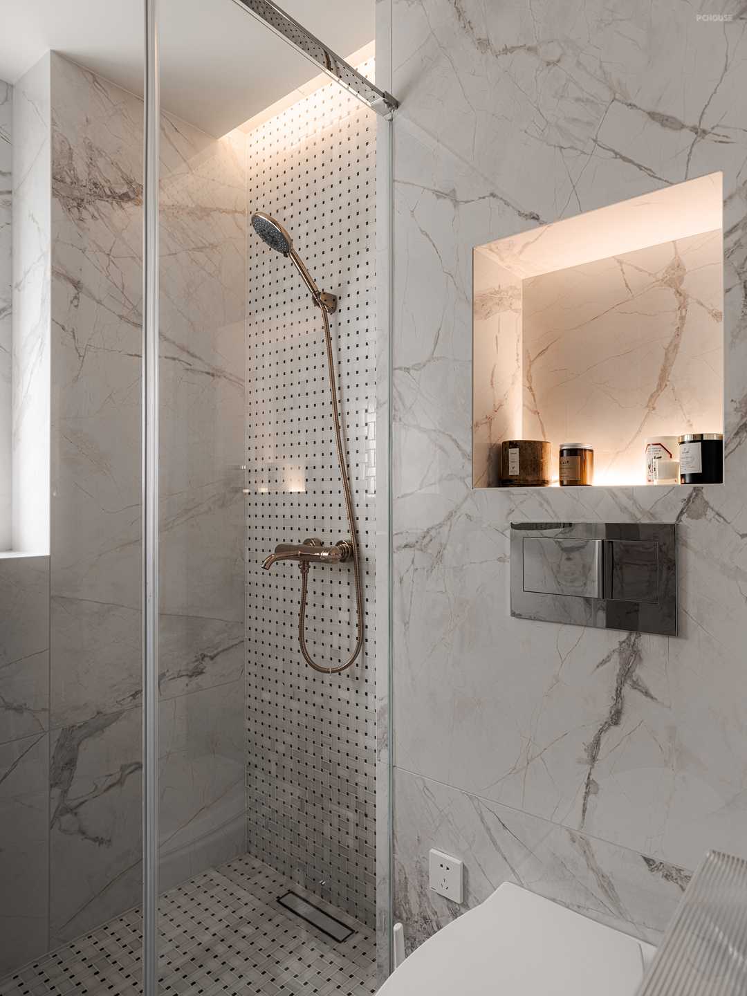 淋浴房,业主希望能找到一种粉嫩的色调,石材里面挑了好多,都没找到满意的,后面就从德赛斯的岩板里选到了一款,现场质感非常好。