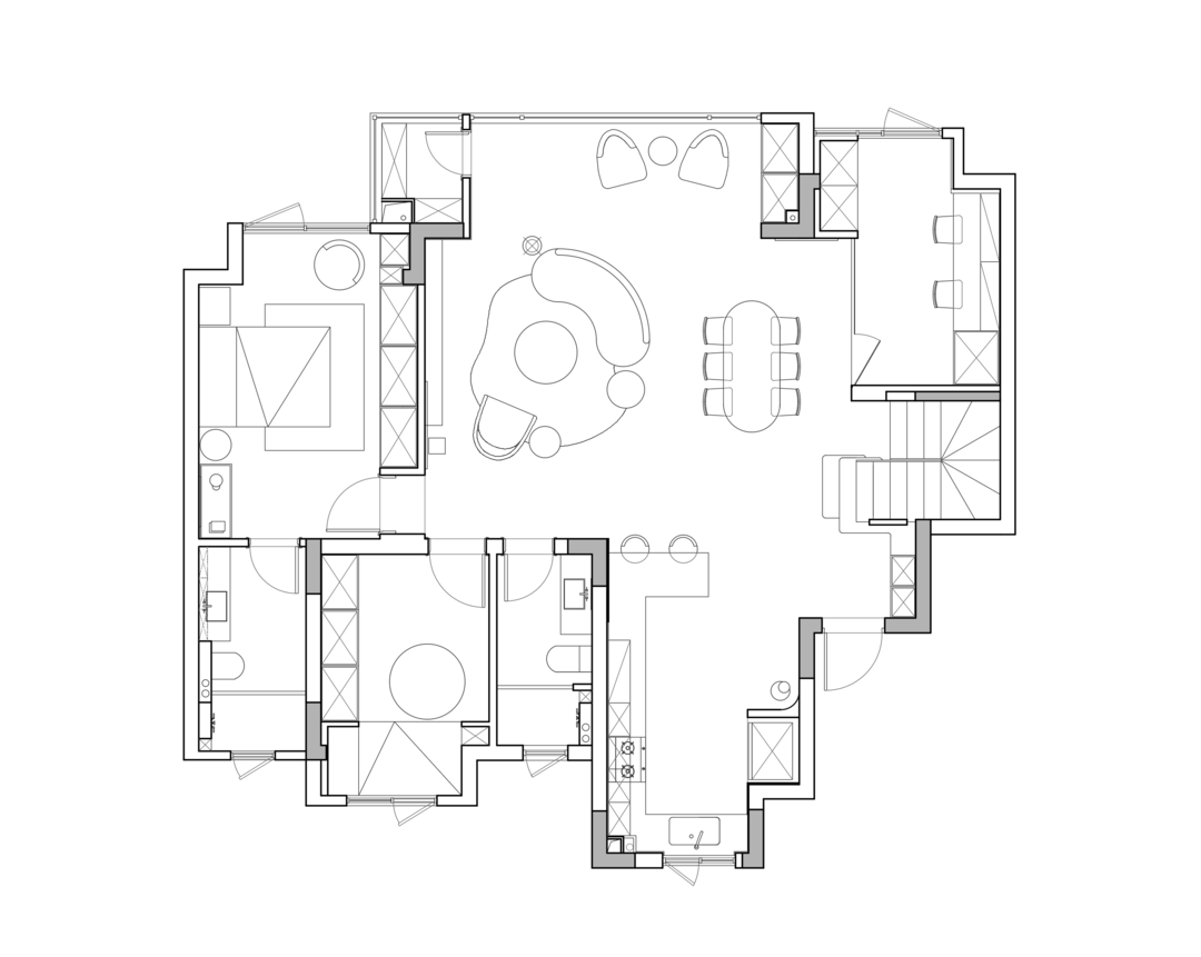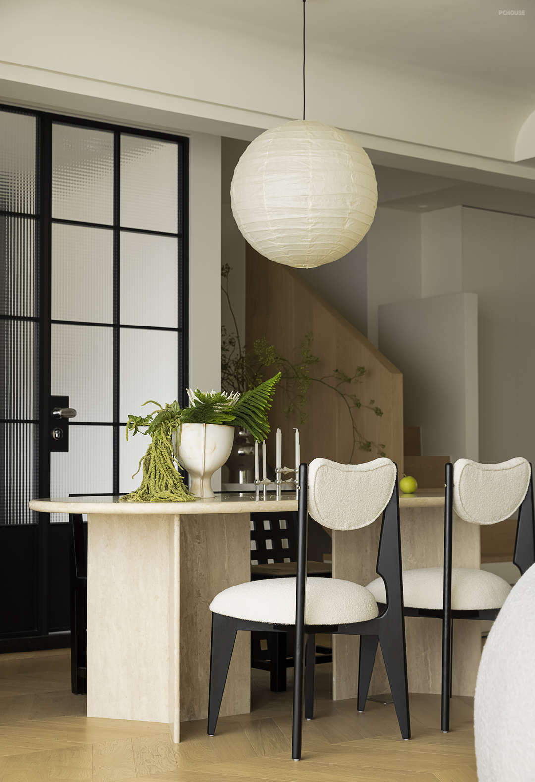 右侧设计了法式风情明显的圆桌造景,配合餐厅主桌,增加复古的光影暧昧氛围,入目成画、自成一景。