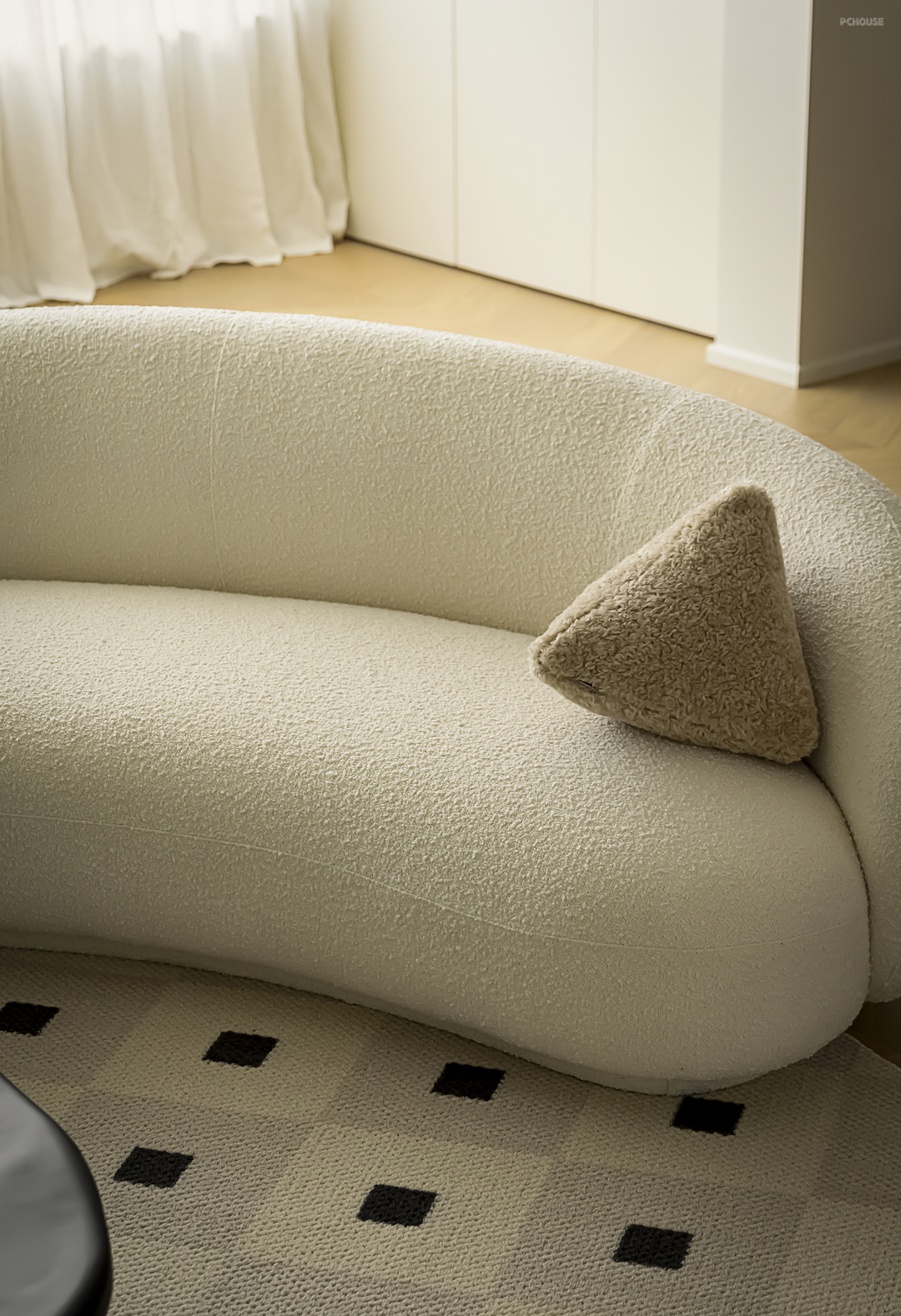 绒的材质也是打造轻法式空间必备的单品之一,沙发的选择则考虑了这一材质的运用,恰如法式优雅所提倡的慵懒气质包裹精致内里,地毯的材质也和沙发形成呼应。