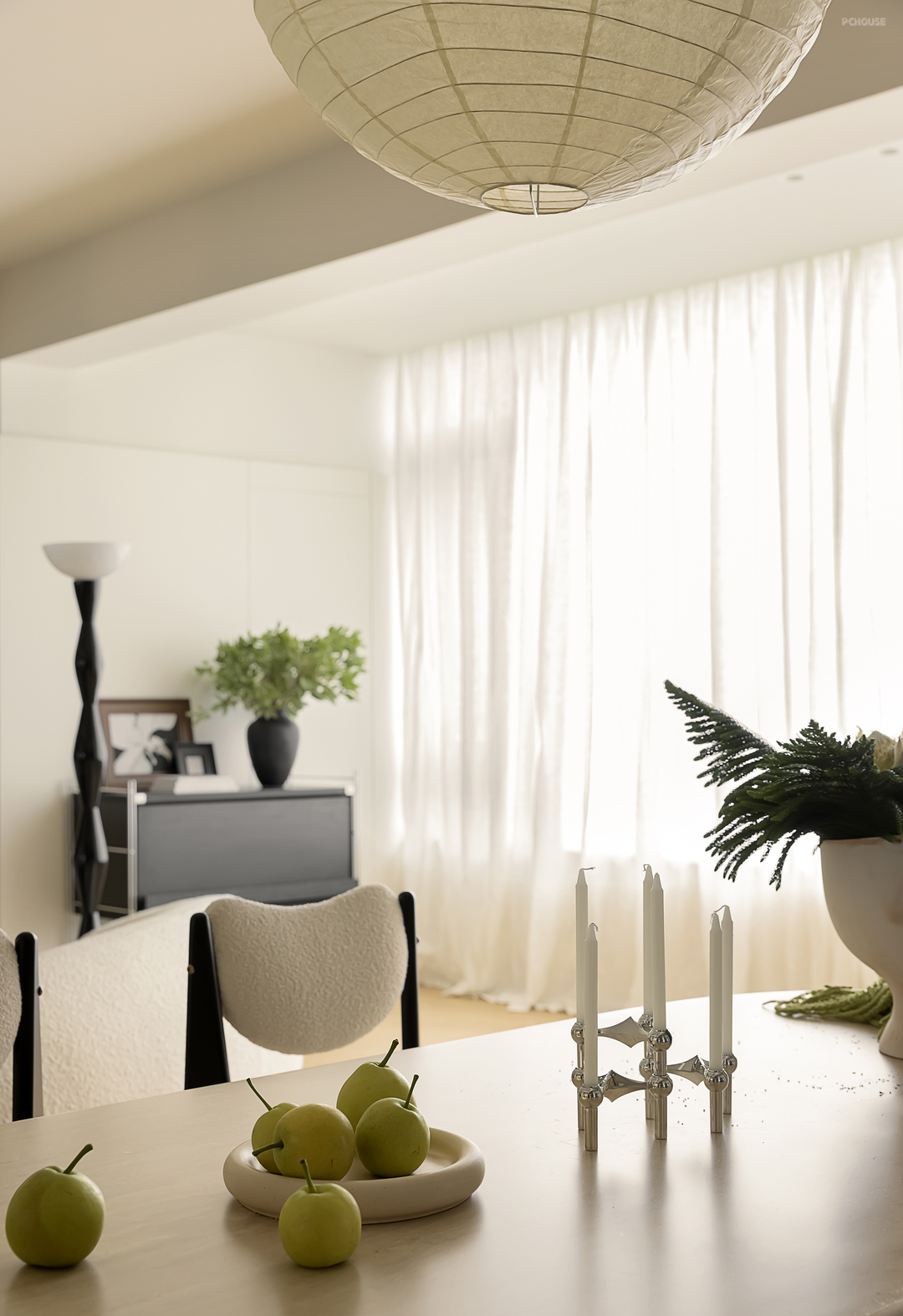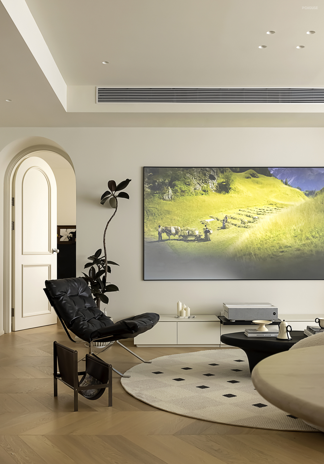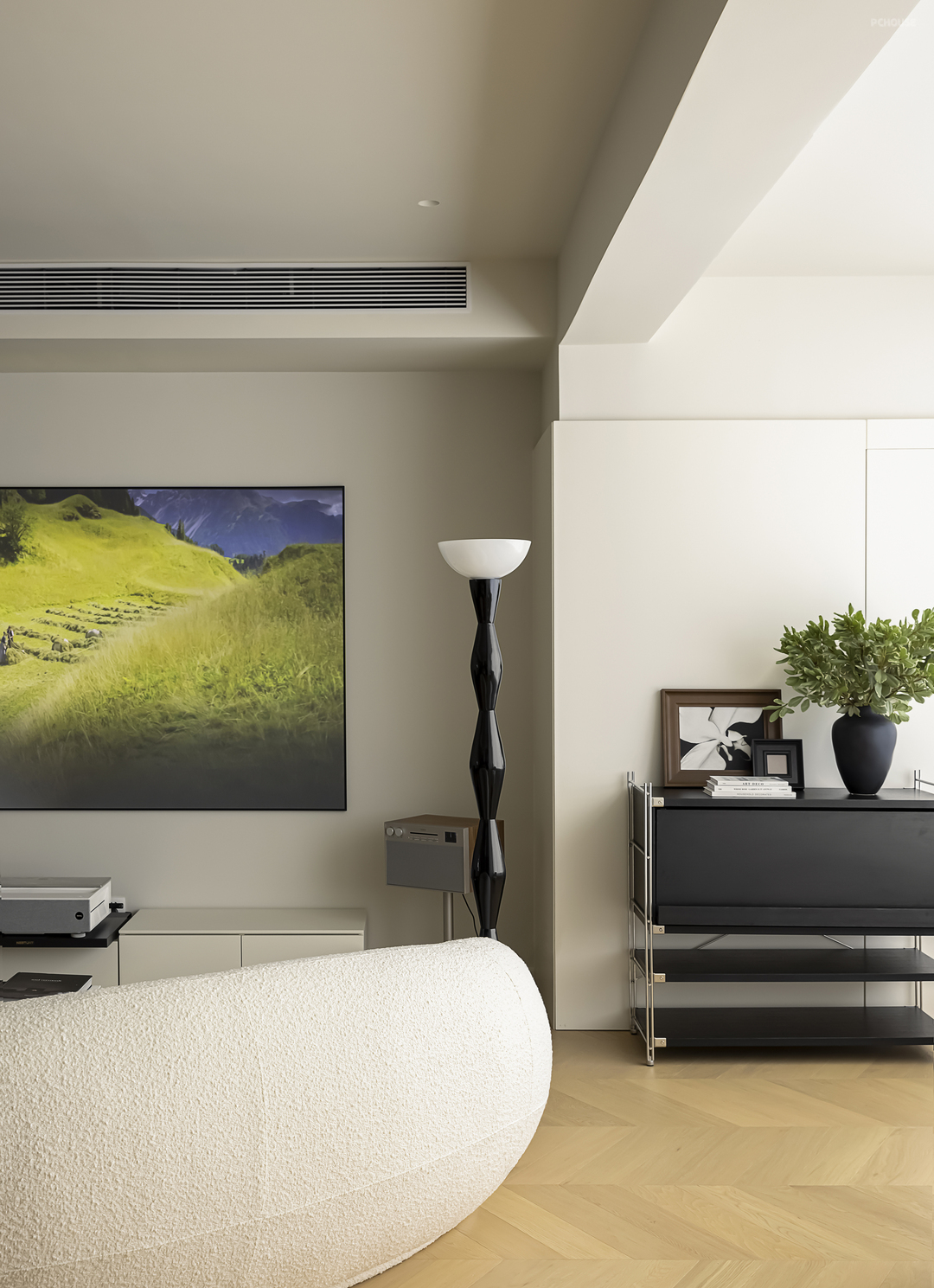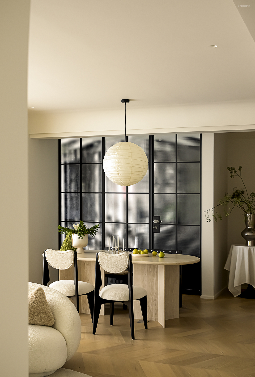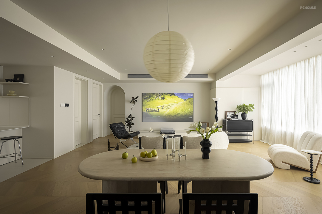 一向被视为重中之重的客厅设计,这次却主打一个“轻描淡写、轻笔细描”。以柔和奶白为大面积底色,加上客餐厨一体的开阔布局,借助视觉上的轻盈感,调动触感上的轻快感,将法式慵懒做到极致。