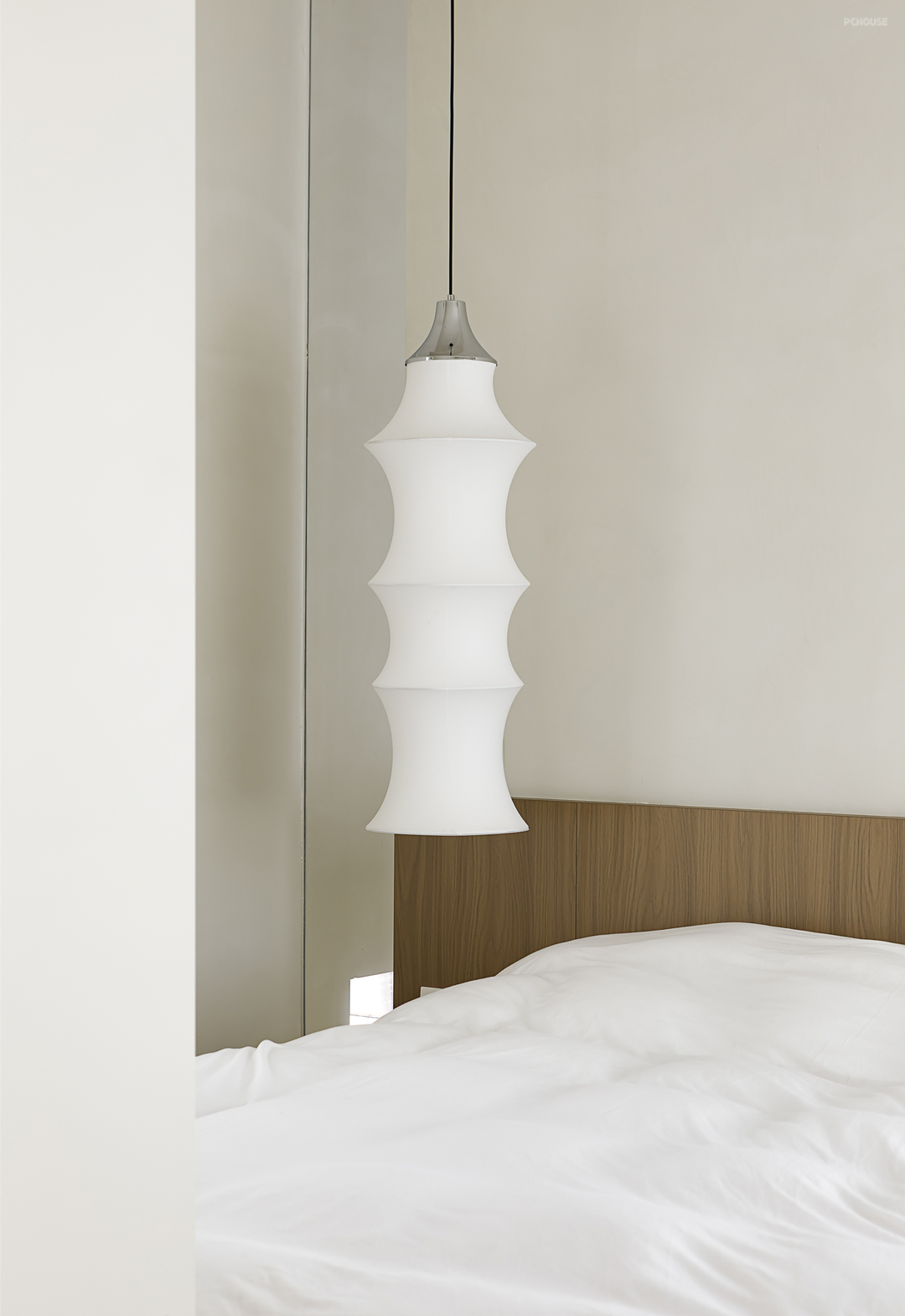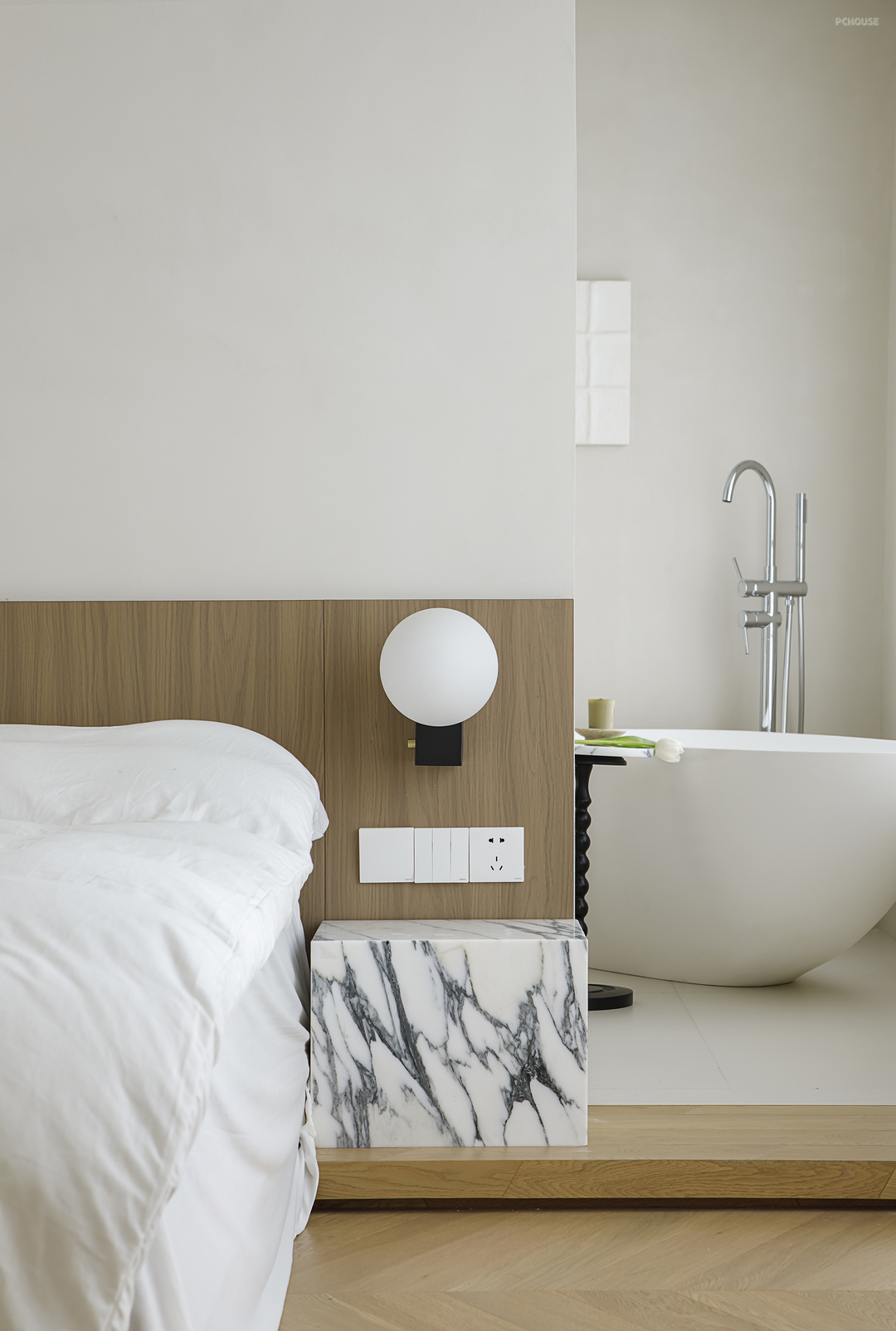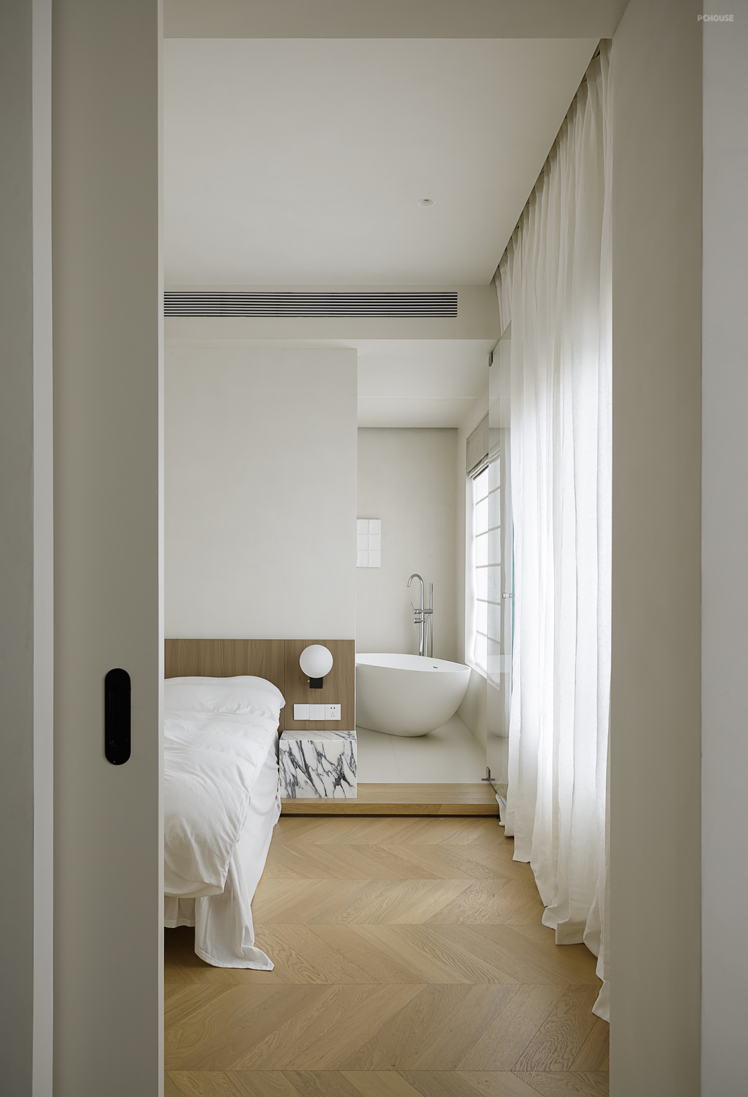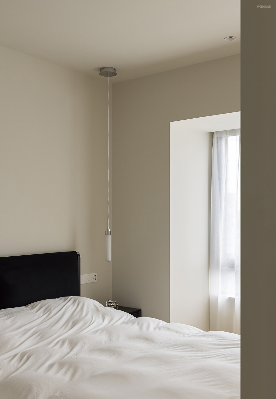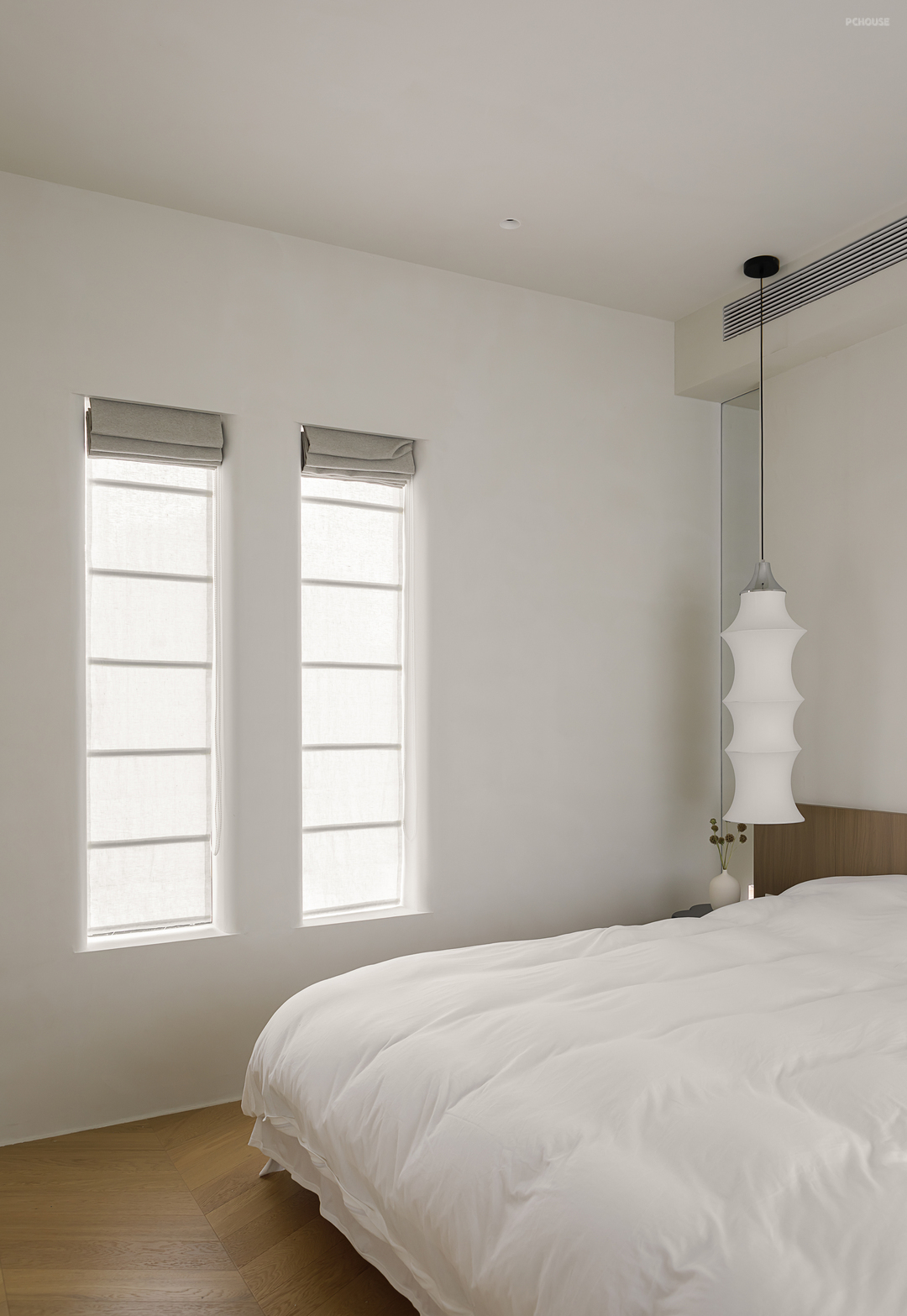 相比一层空间在克制之下依然运用了不同元素的叠加,二层主卧更为化繁为简。