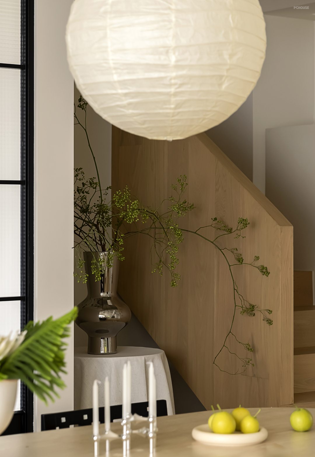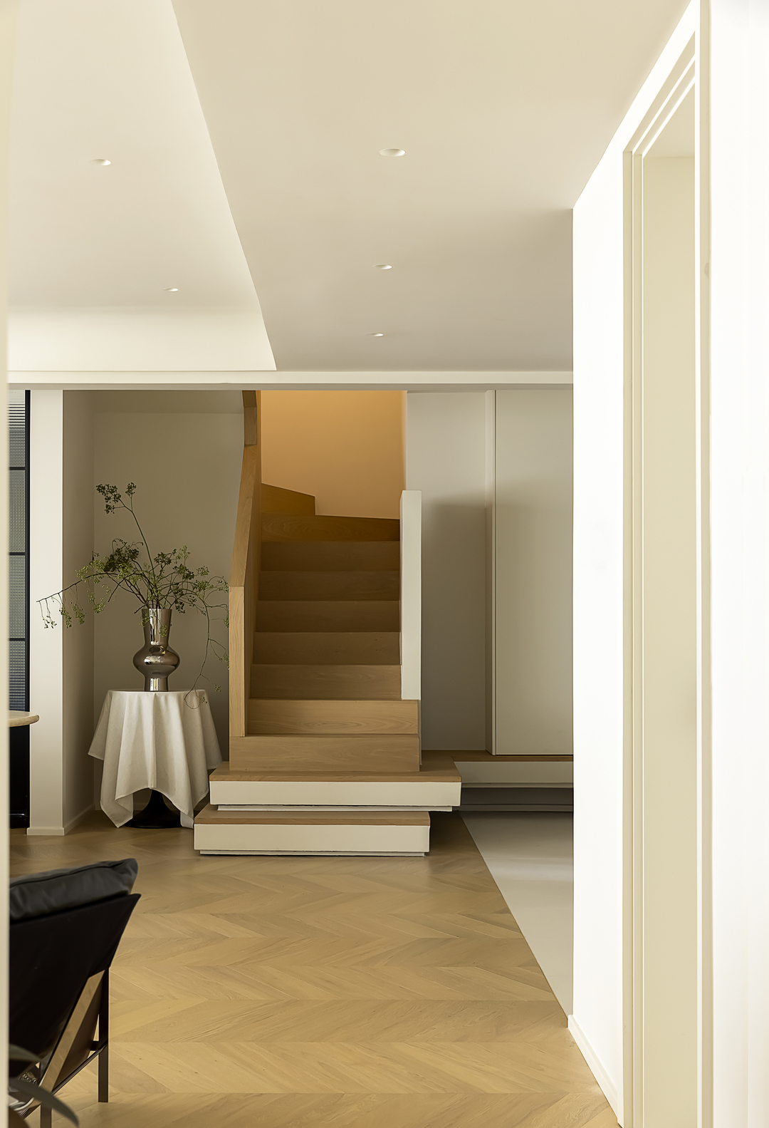 楼道的设计重点在于阶梯左右两侧的空间利用,左侧从入户玄关延伸而来,形成错落阶梯,起到入户视觉的隔断,同时增加空间的不规则感。