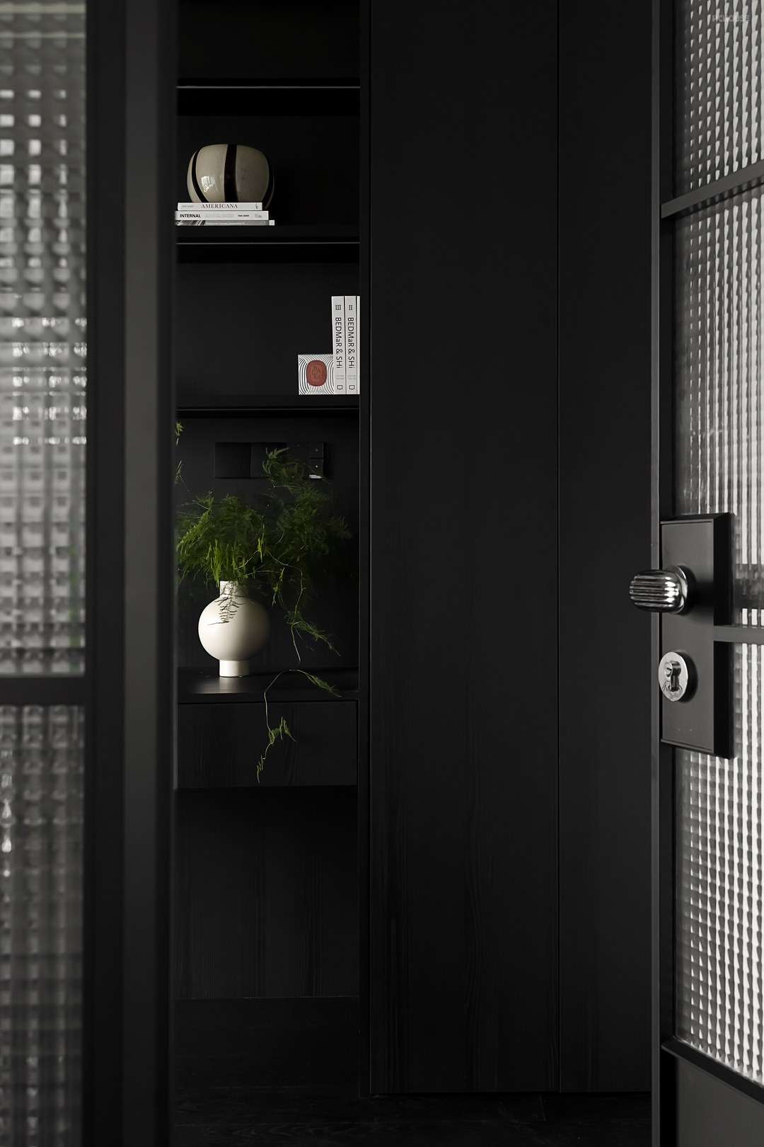 比起客厅的奶白色调,书房以几乎是浑然一体的全黑色调,材质选择上和客厅的黑色元素保持一致,更加有纹理感。