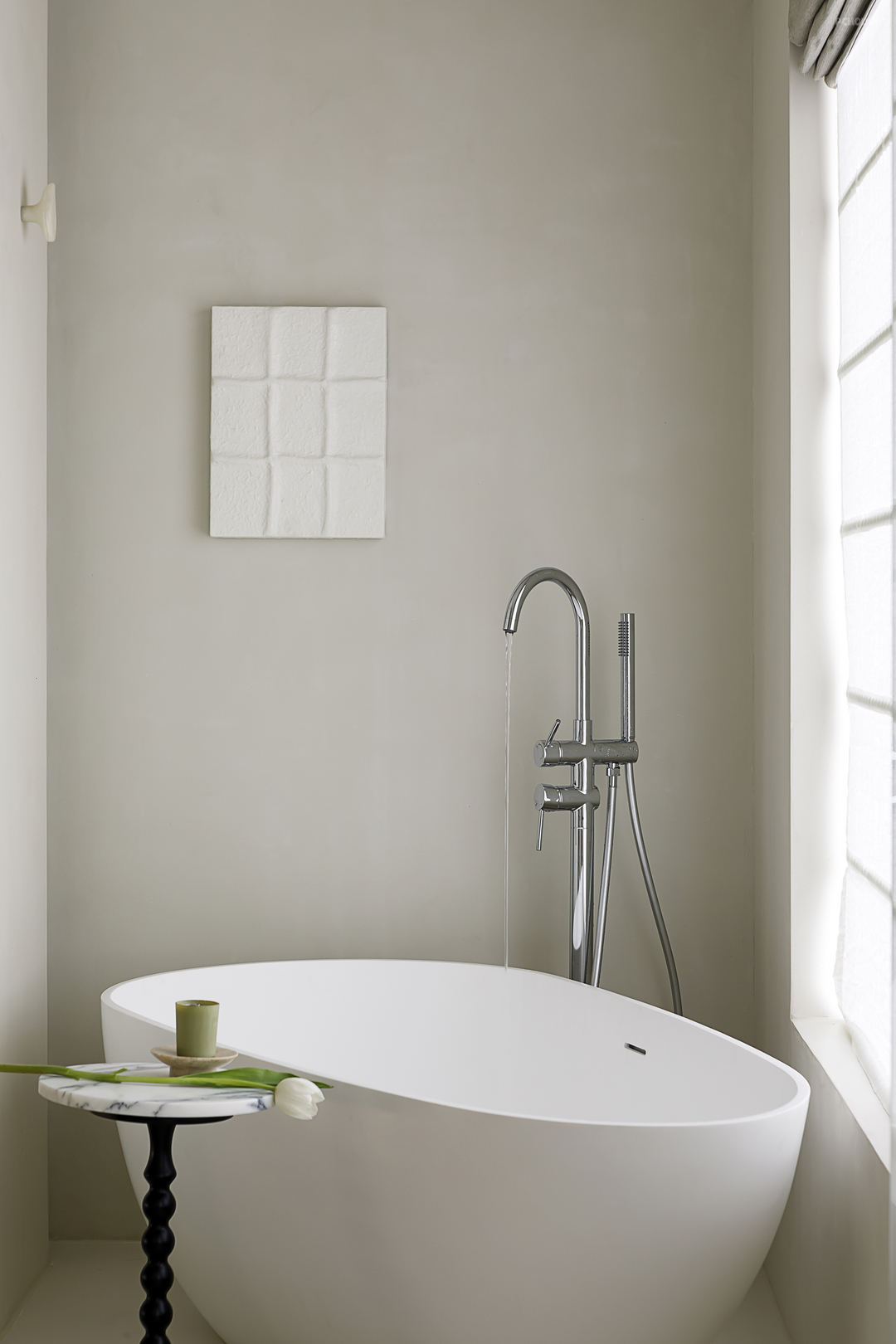 当然,这块空间的视觉重点还在于墙上的石膏纹理墙砖,让平平无奇的白墙有了颇具艺术感的细节,自然而然联想到法国一系列文艺复兴雕塑作品。