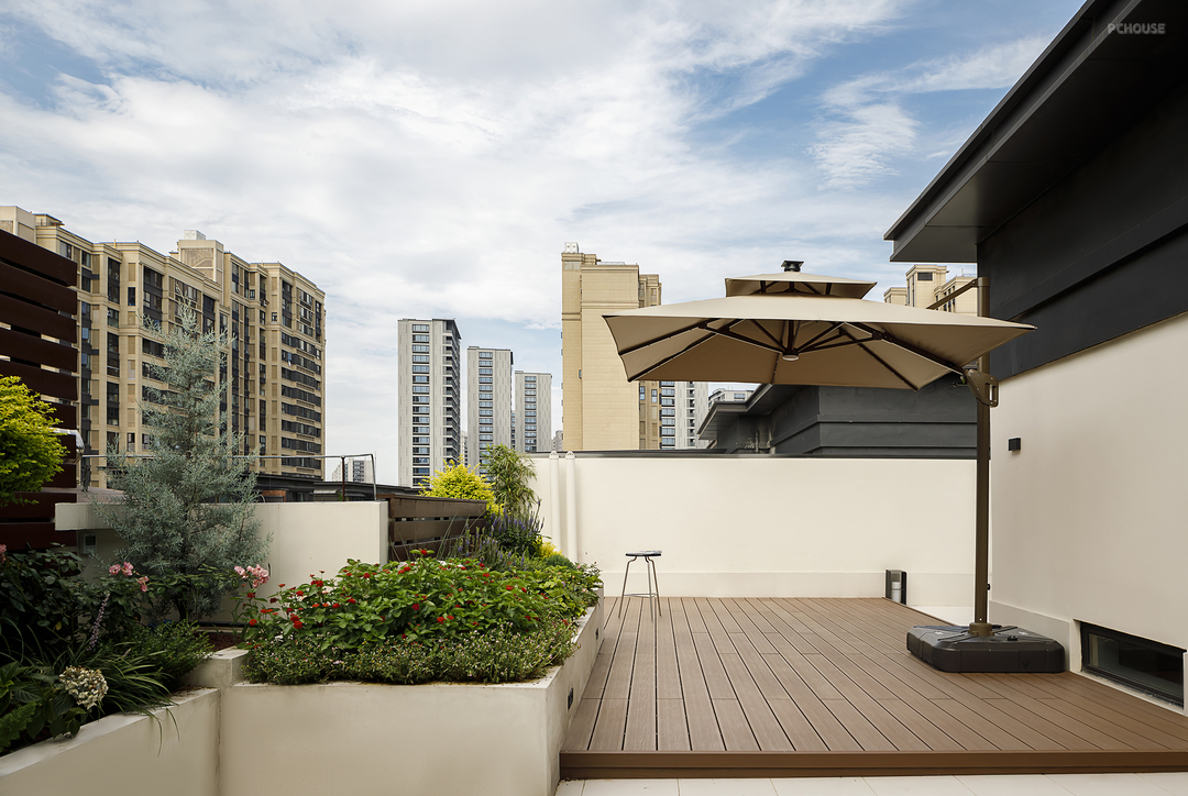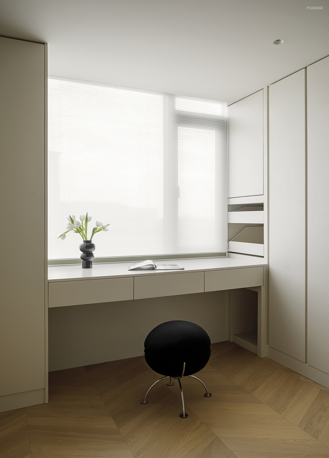 只选取柔软低饱和的窗帘和床品,辅以原木地板,以素白视觉彰显这一休息空间的纯粹,无不对外传递着这是只想好好躺平的地方。