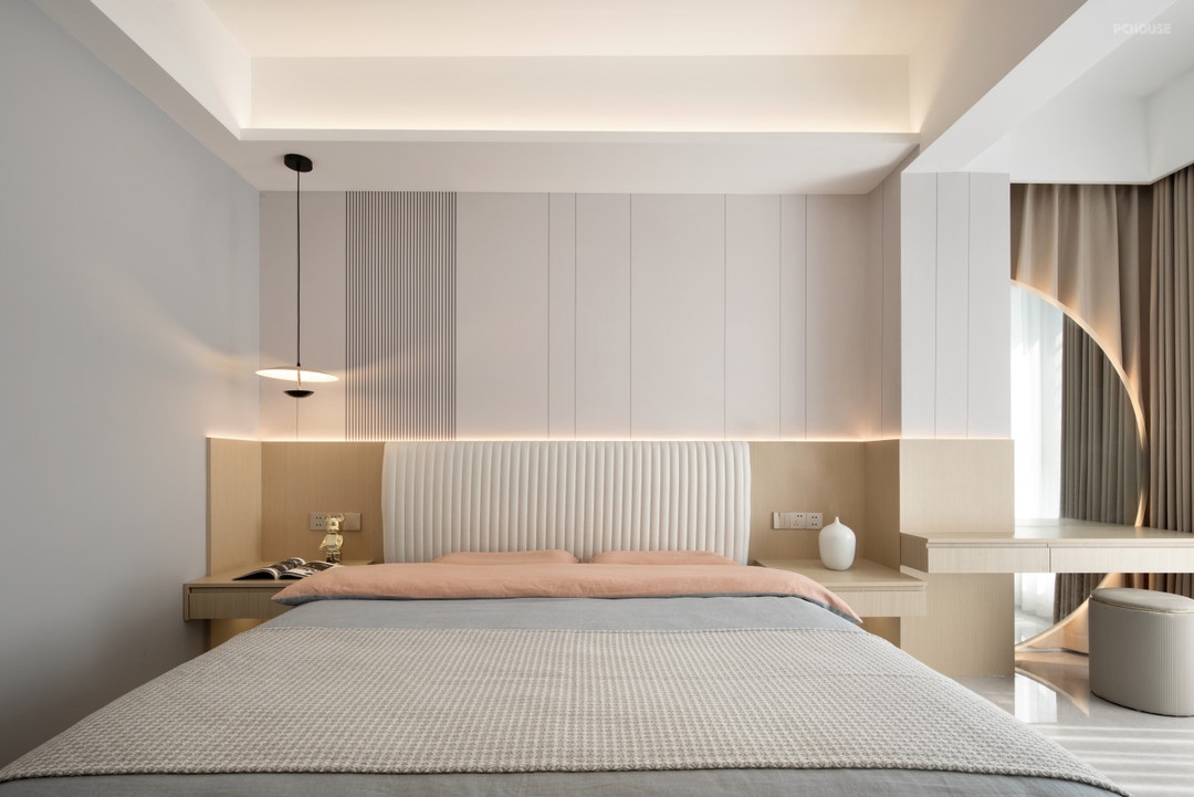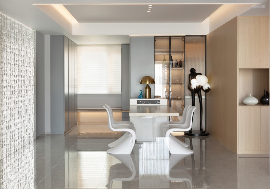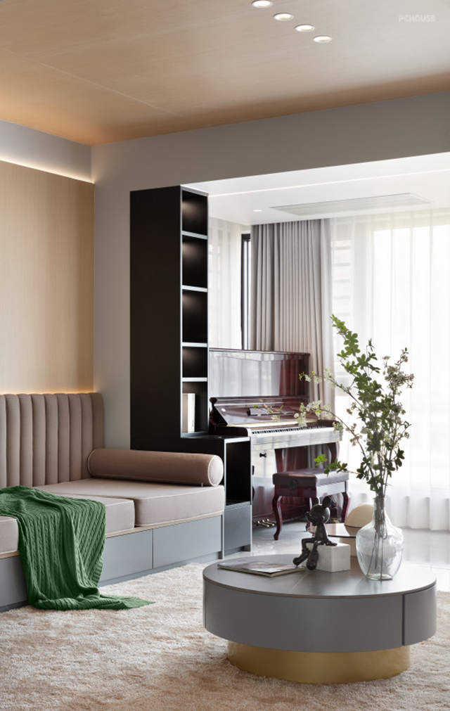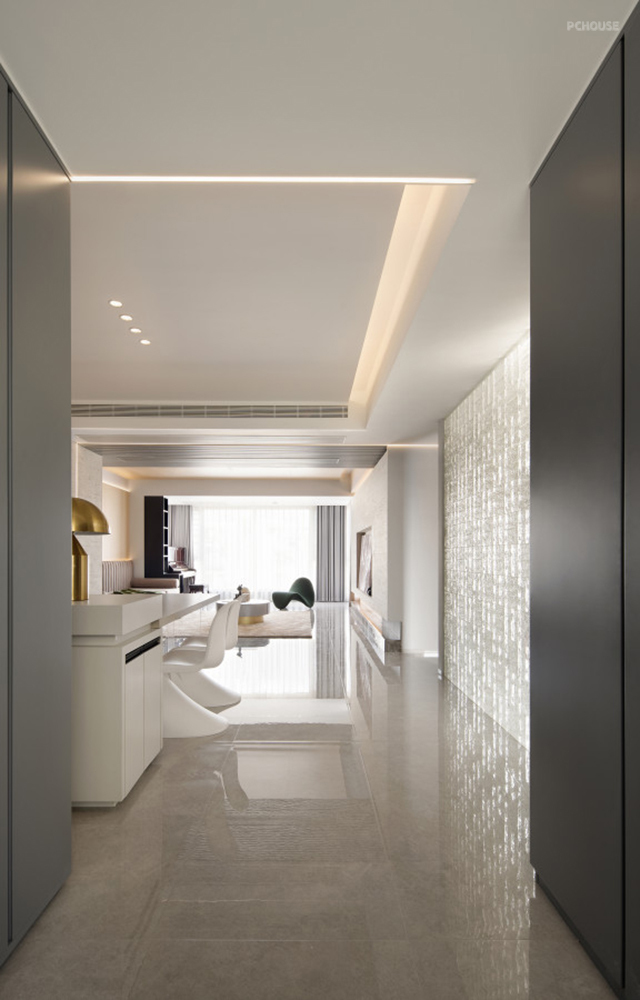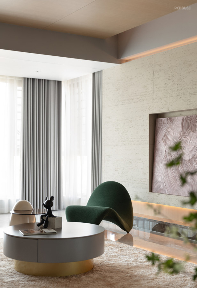 本案设计多用木饰面,软石板,玻璃,来表达空间的灵透质感。因为空间是北向在自然光线中是偏冷色光源,所以为了让空间更有温度所以使用了大量中性色温,通过大面积用低饱和度的饰面且又能满足温暖的整体效果,搭配灰色通体地面、木制品、门等一个整体相得益彰,块面的穿插与线的糅合相互影响相互拉升空间让其简约不简单,黑色经典的点缀更然空间更彰显沉稳和魅力。