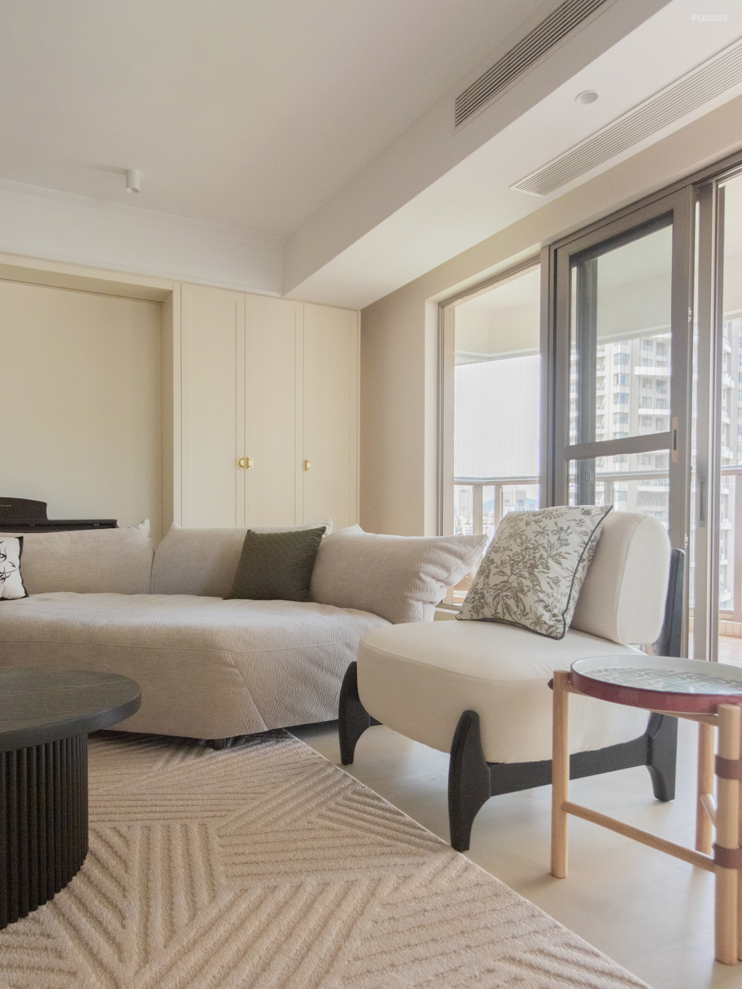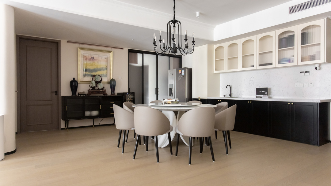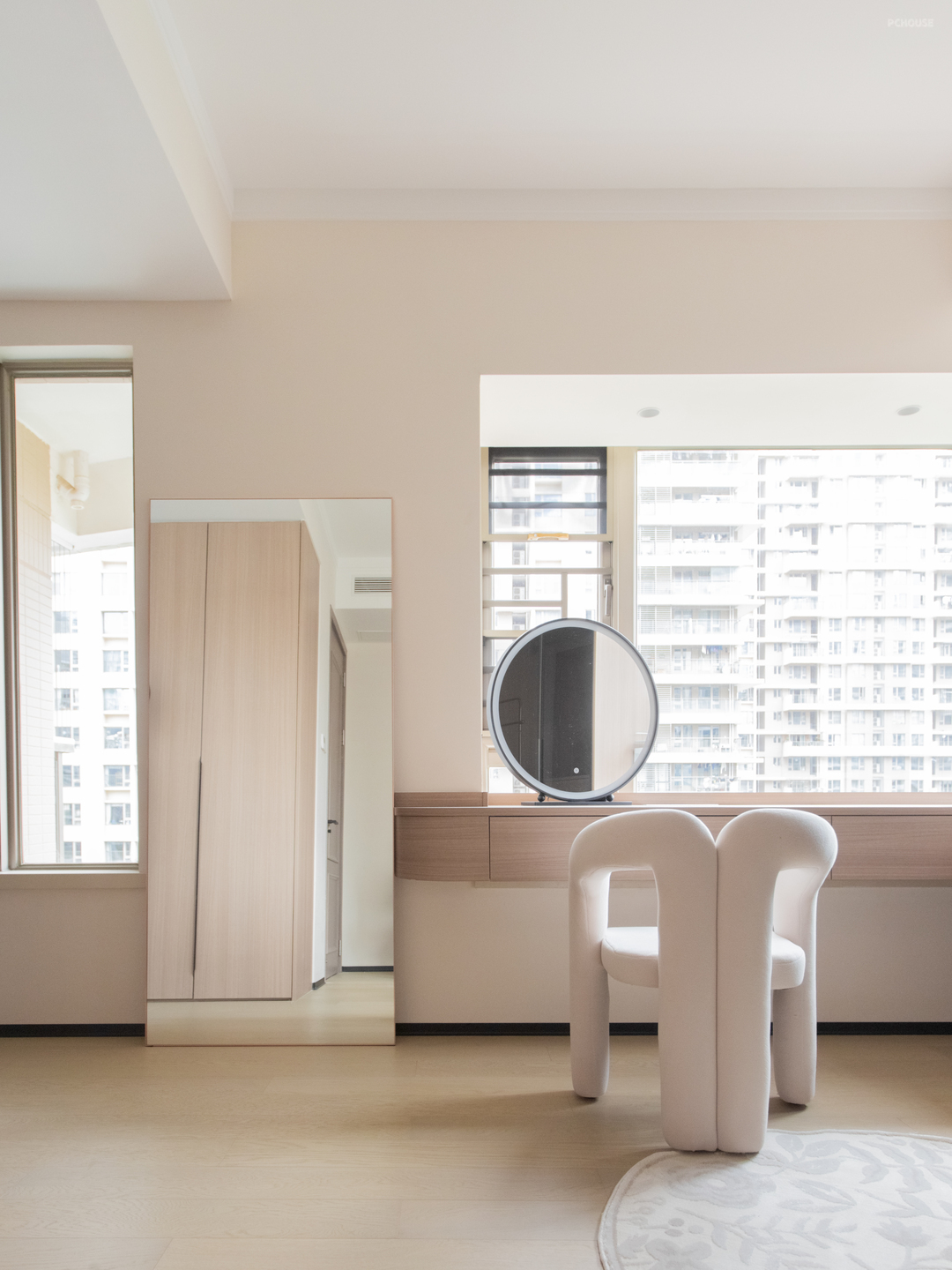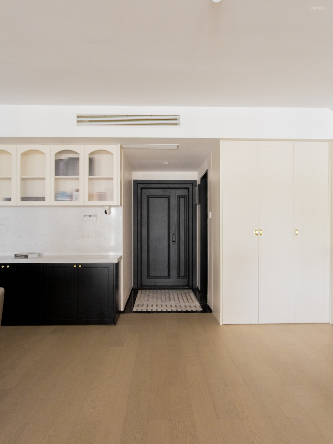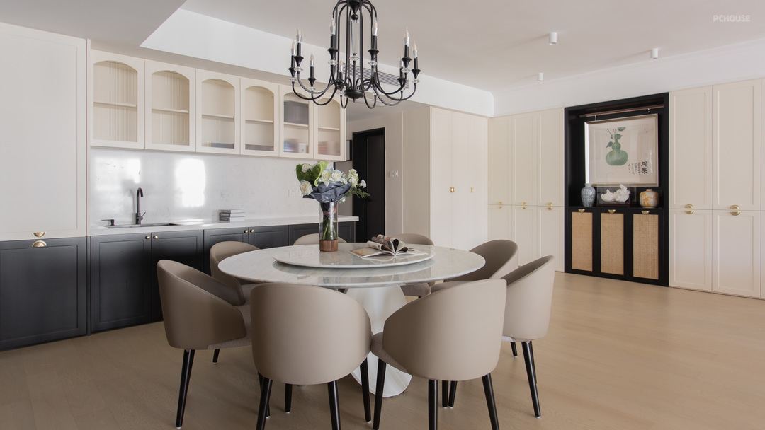 奶油白的暖色调里穿梭着石膏线的精致,玻璃与实木地板所营造的法式浪漫在不经意间流淌;家是生活的地方,是舒适的空间在精致与美的同时不失舒适,回到家中从视觉中感受到舒适。