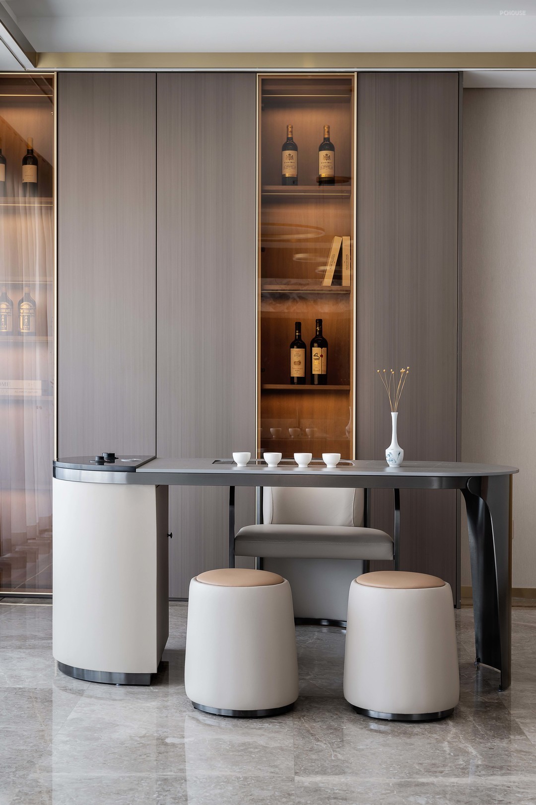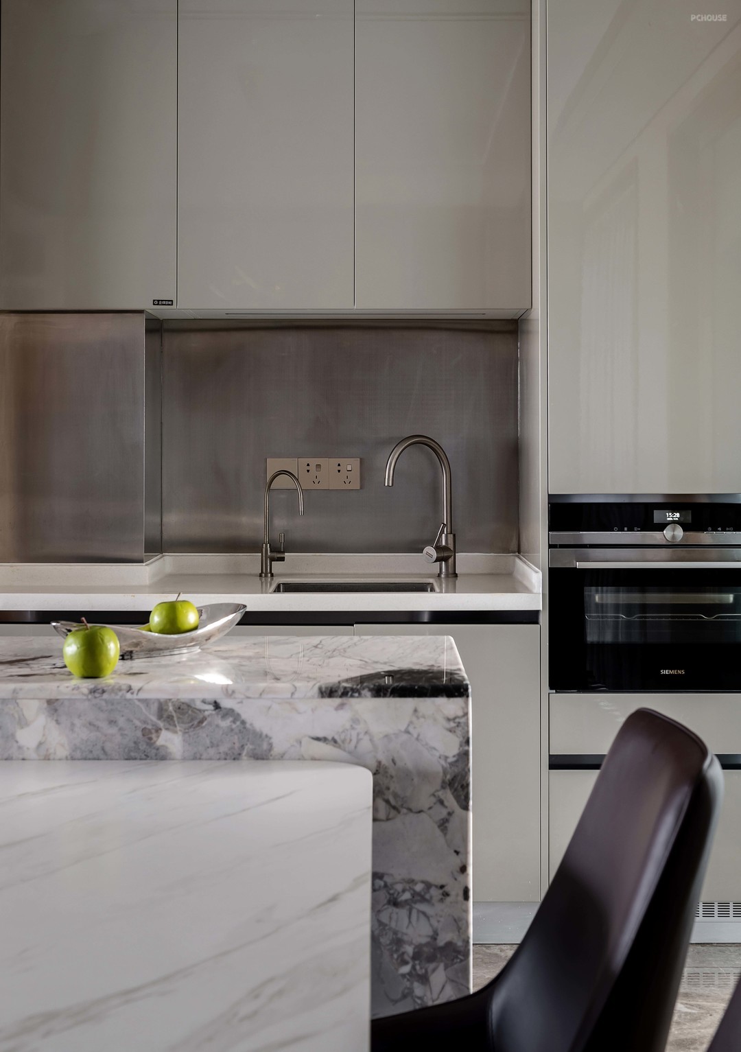 餐厅延续了客厅的整体色调,在餐桌旁设置了岛台,大大提升了餐厨的操作台面,并且岛台也有储物功能,解决了收纳的问题;通过材质上的奢华,不着痕迹地透露着精致和生活的追求。