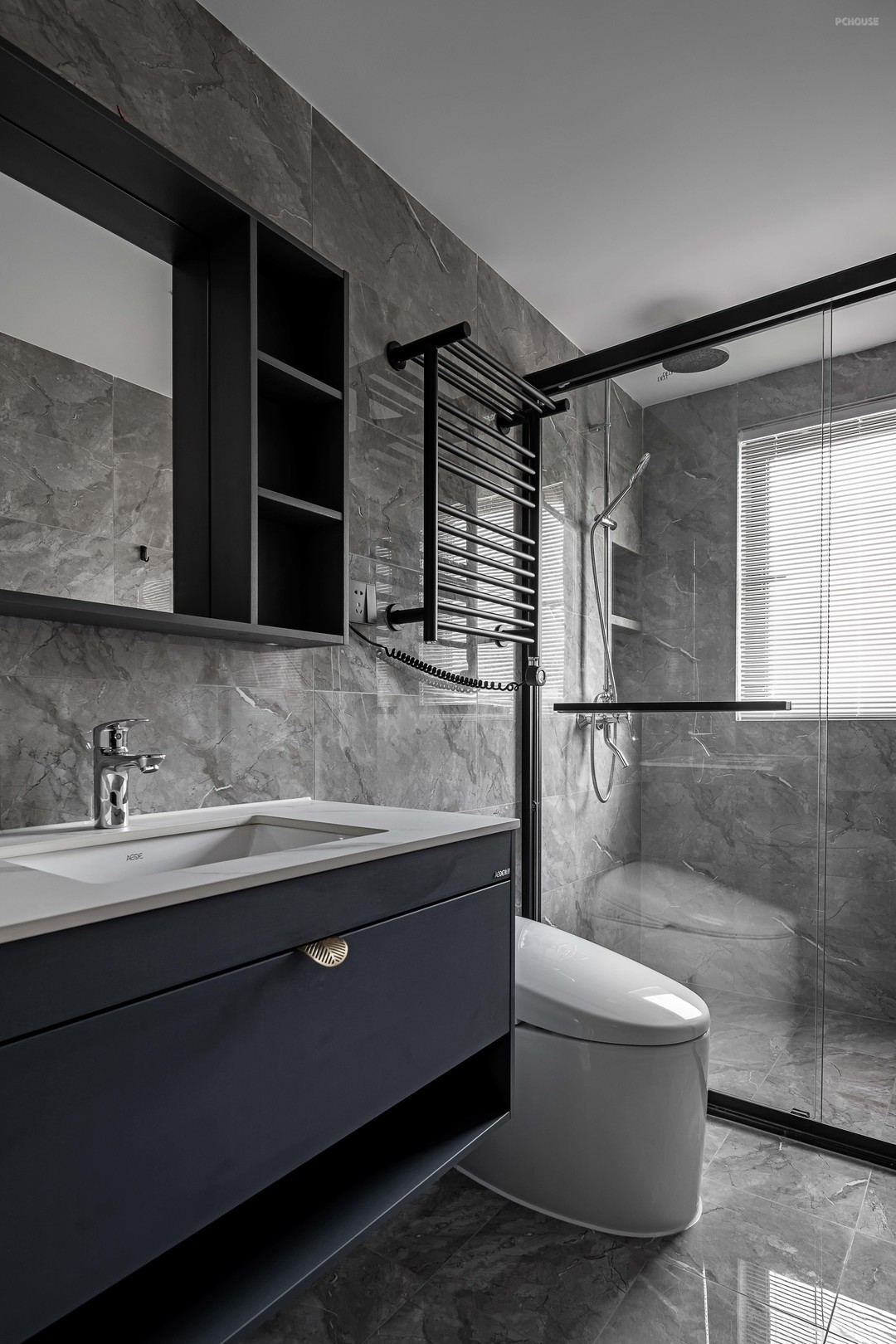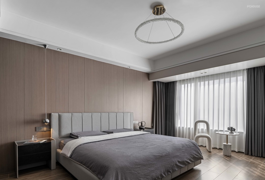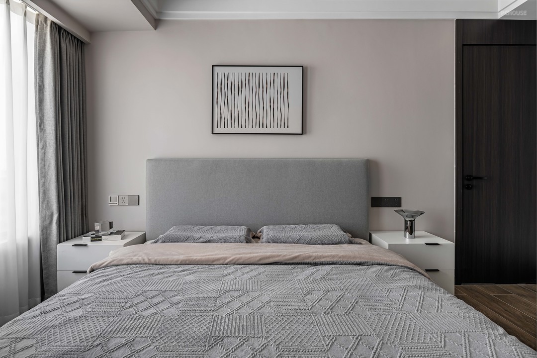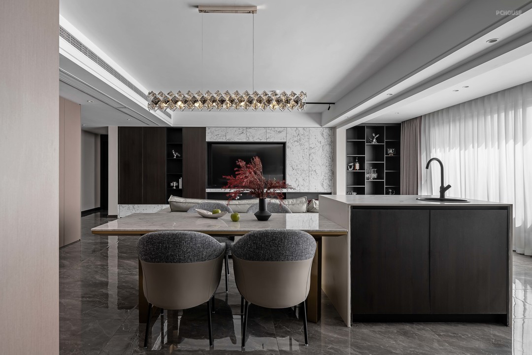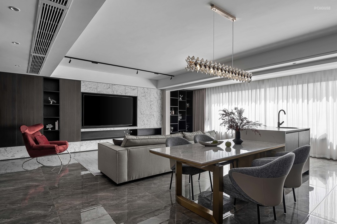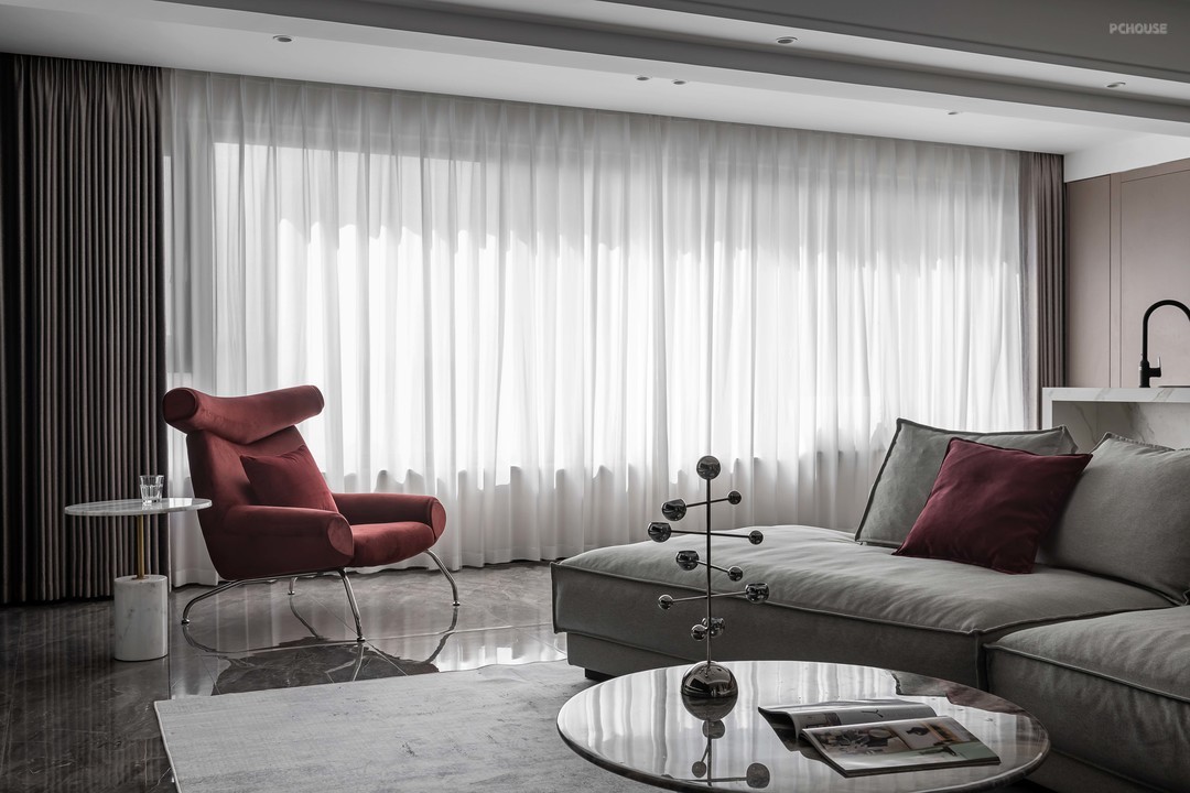 将阳台和客厅打通后通过硬朗的硬装搭配着浅灰色布艺的沙发及餐凳,稳重的配色加一组暗红色的单椅及抱枕,让你在空间中瞬间卸下疲惫,更让能让人在这沉稳的空间中眼前一亮