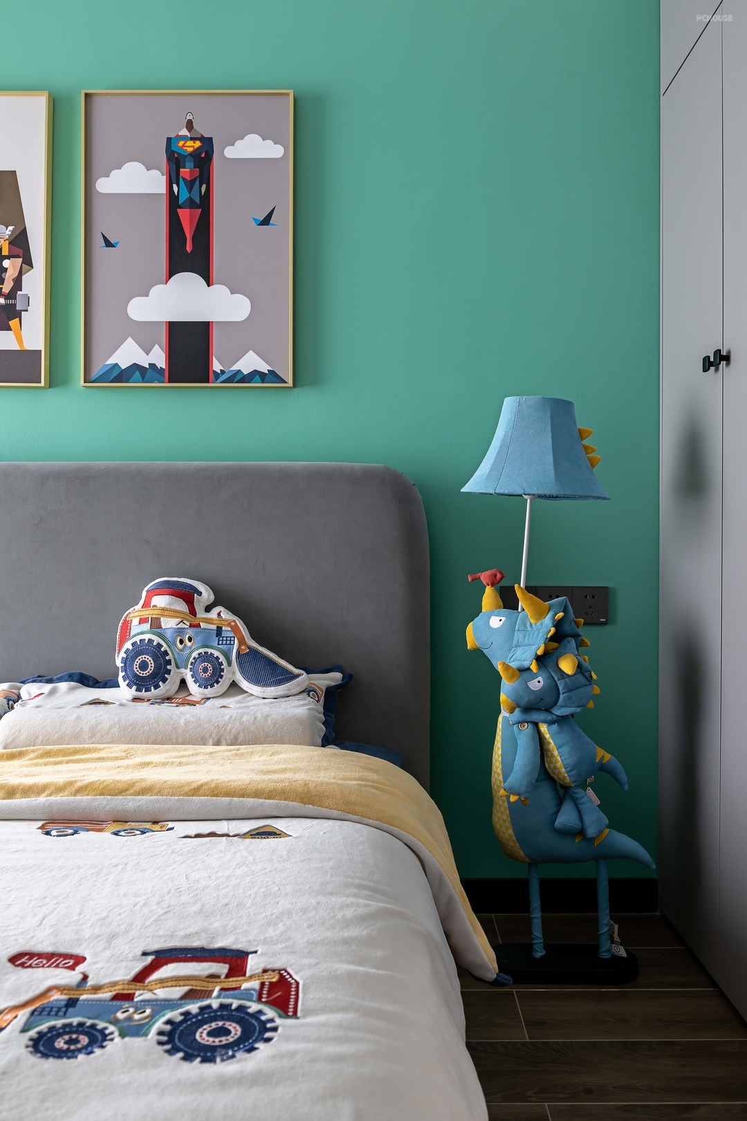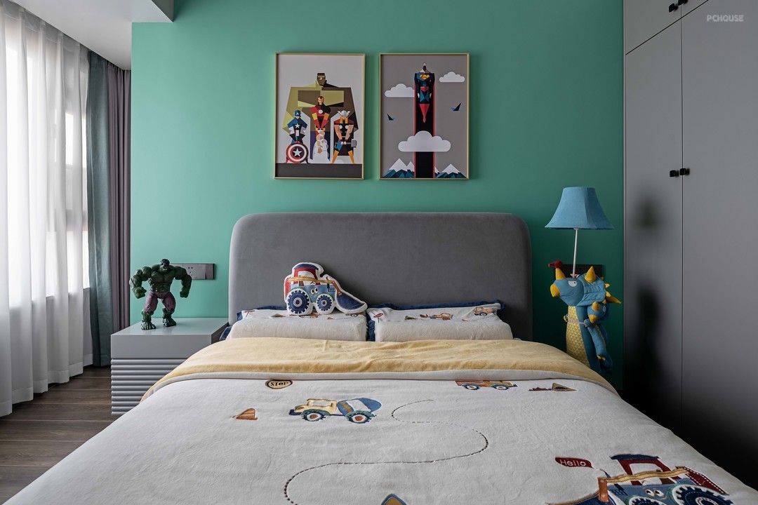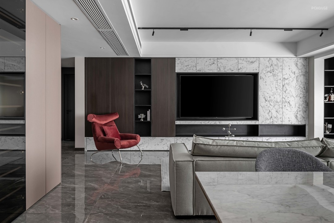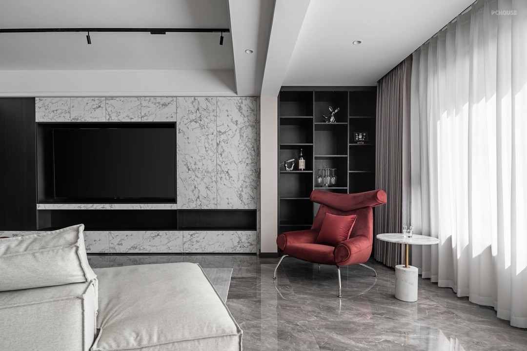 为了满足超多收纳,电视墙也发挥出最大的收纳作用,但为了不过于呆板,在此处增加了仿石材纹理的板材来做柜门,同时增加了开放格,让整个电视墙在这个空间成为视觉焦点