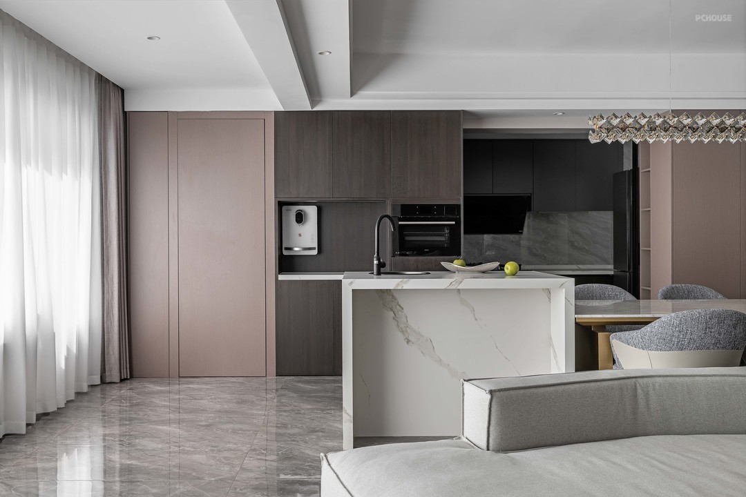 厨房和餐厅连通中间做联动滑门,让厨房和餐厅完美衔接,可以是开放式厨房,也可以随时封闭;餐边柜也是同色系搭配,为了考虑实用性,利用原始户型上的尺寸优点,刚好把蒸烤箱设置在餐边柜的位置,搭配岛台使用,也方便西厨的使用