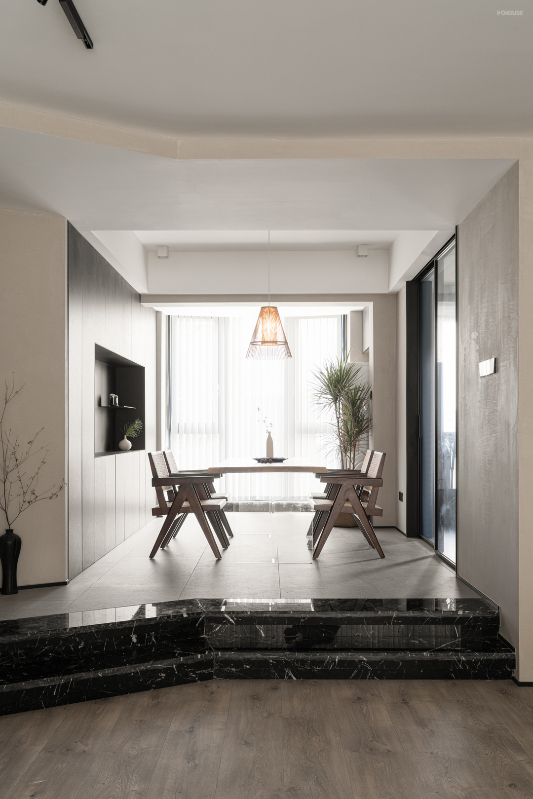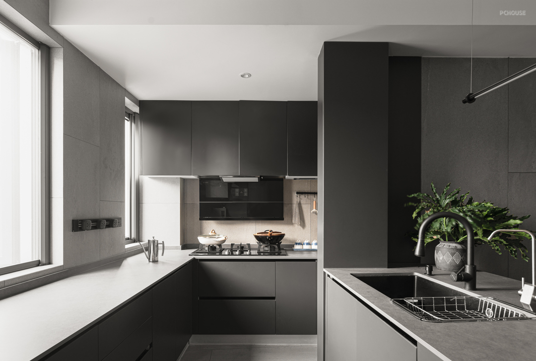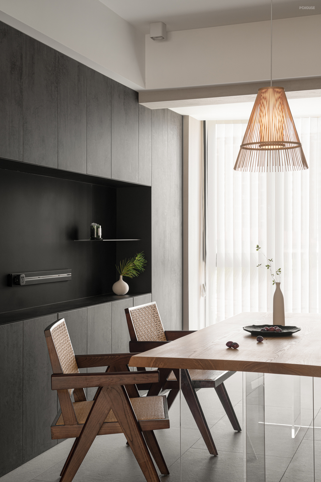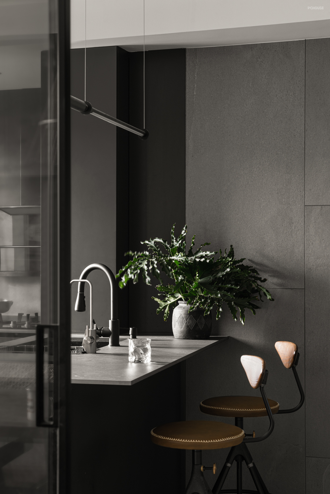餐厅延续了厨房的黑色系风格,中间敞开部分都是由钢板定制,可以储物以及一些简单的喝水泡茶操作。