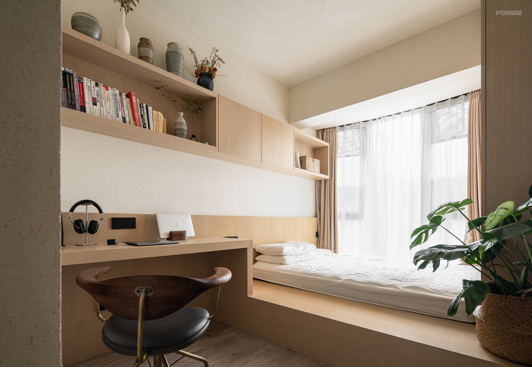 原木版窗台和床以及墙面稻草漆整体搭配和谐。