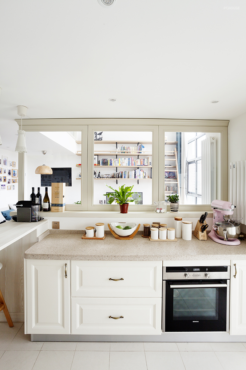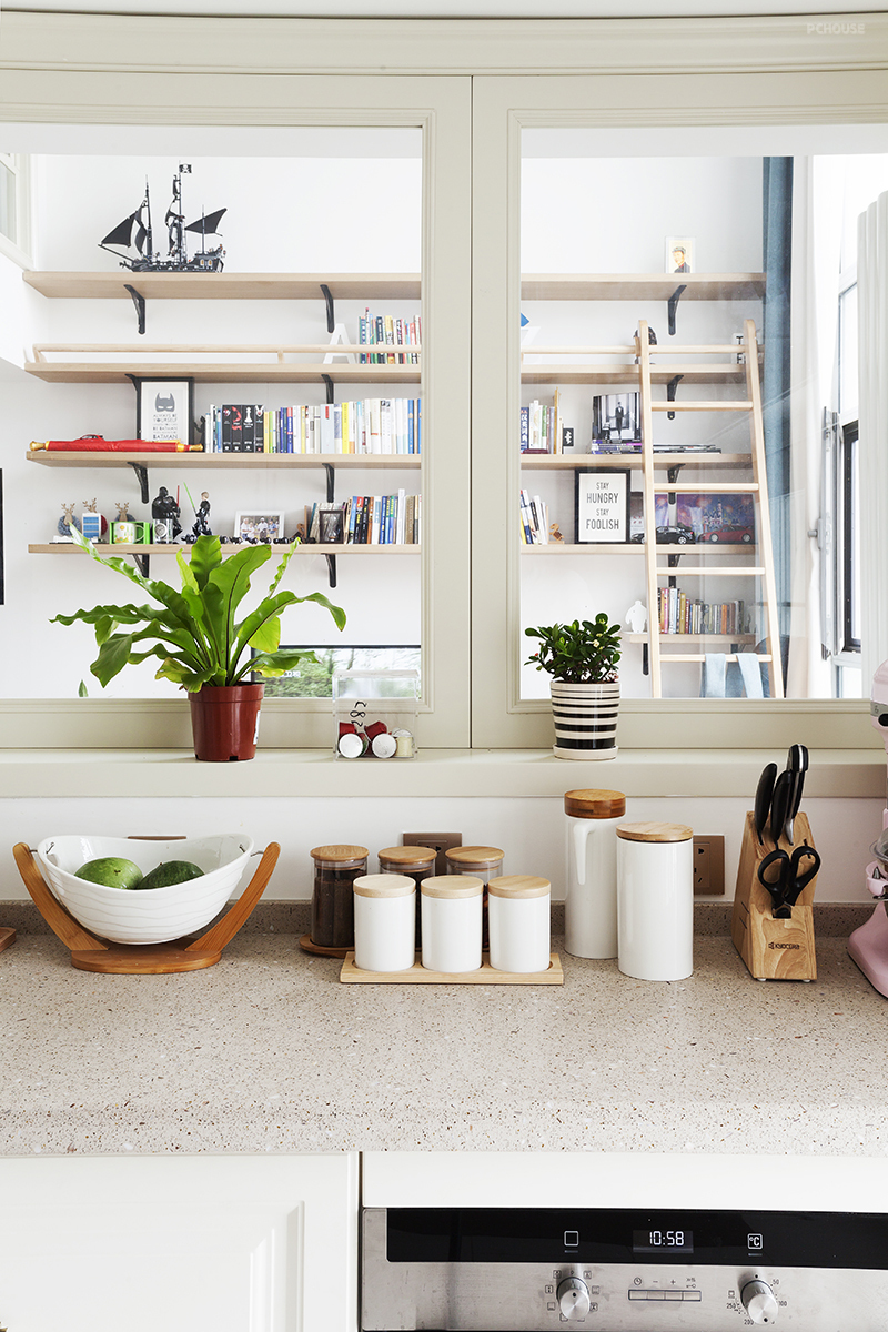 由于女主人喜爱烘焙,特地购入了Kitch Aid Artisan厨师机,不仅因其实用性强大,更因其高颜值的设计,契合了她对高颜值设计单品的喜爱。厨房的工作台则被精心收拾,井井有条,以满足她作为处女座的整洁追求。
