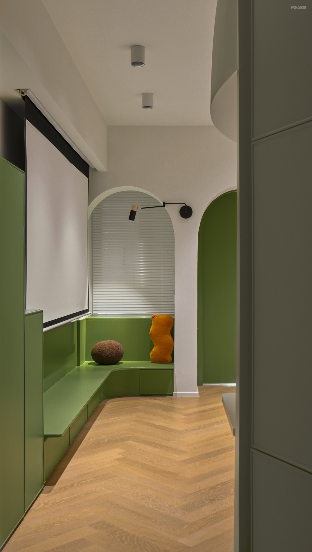 屋主在儿子即将上小学一年级时买下这套56㎡的学区房,原本一室一厅的简单格局,站在门口就可以把家中的空间看完。但为了让一家三口在接下来的生活中能够住的舒心且有足够的活动空间,设计师巧妙地在客厅挤出一个趣味蛋屋,运用红黄绿三种跳跃的色彩构成无形间将家放大,家中收纳、学习、办公、玩乐全满足。