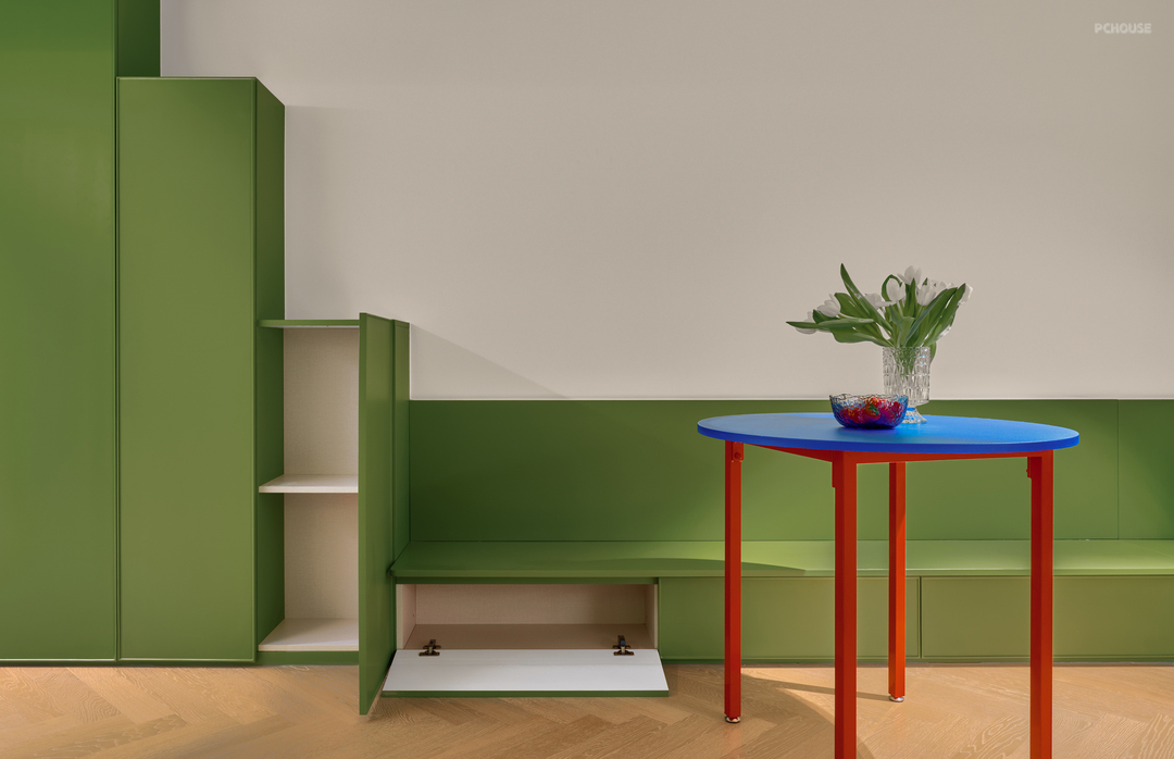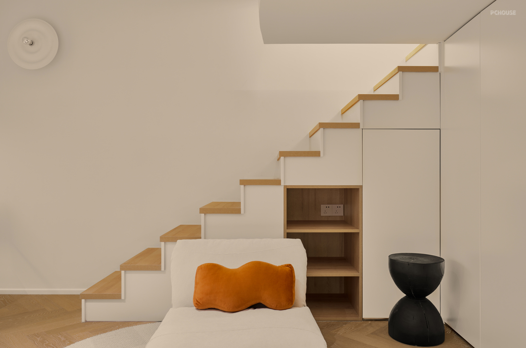 蛋屋下方高度为1.75cm,作为小朋友平时学习阅读桌使用,台阶下方空间作为公区的收纳补充连接衣柜,榨干家中的每一寸可利用的空间。