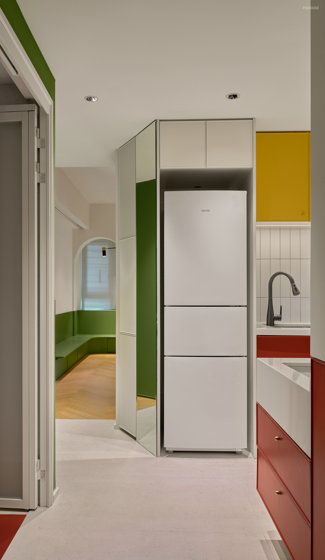 开放式的厨房设计L型操作台,上黄下红的橱柜组合,墙面米白的长条砖,油烟机也特意选用相近的颜色让整体不会突兀。冰箱内嵌式设计,转角的过道两侧都做了平行斜角处理,让过道的宽度不会因为增加收纳柜而显得忽宽忽窄。