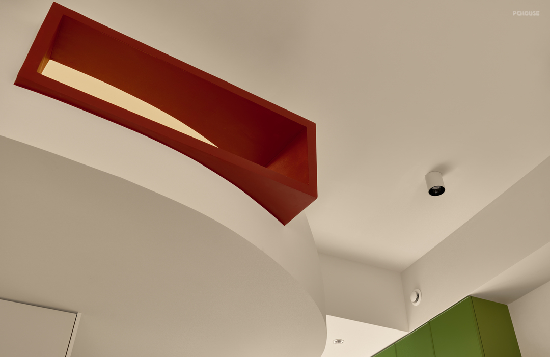 客厅中最大的的亮点就是这个圆鼓鼓的蛋屋,半圆球的造型还定制了红色的小窗口,这里是属于小朋友的小小天地,透过蛋屋窗口能看到用餐的家人。