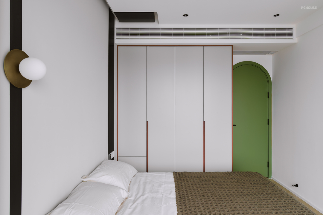绿色圆拱门背后的主卧,为了保证其原有的品质,相比于公区,睡眠区域的颜色更加柔和,整体以浅灰色为主基调。