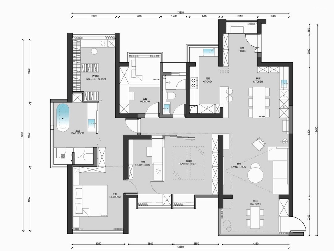 ①空间功能重新规划,业主为一家三口,原户型为紧凑5居,设计师打破空间限制,根据需求重新规划功能,将紧凑型居住,转换为奢适享受的空间体验;