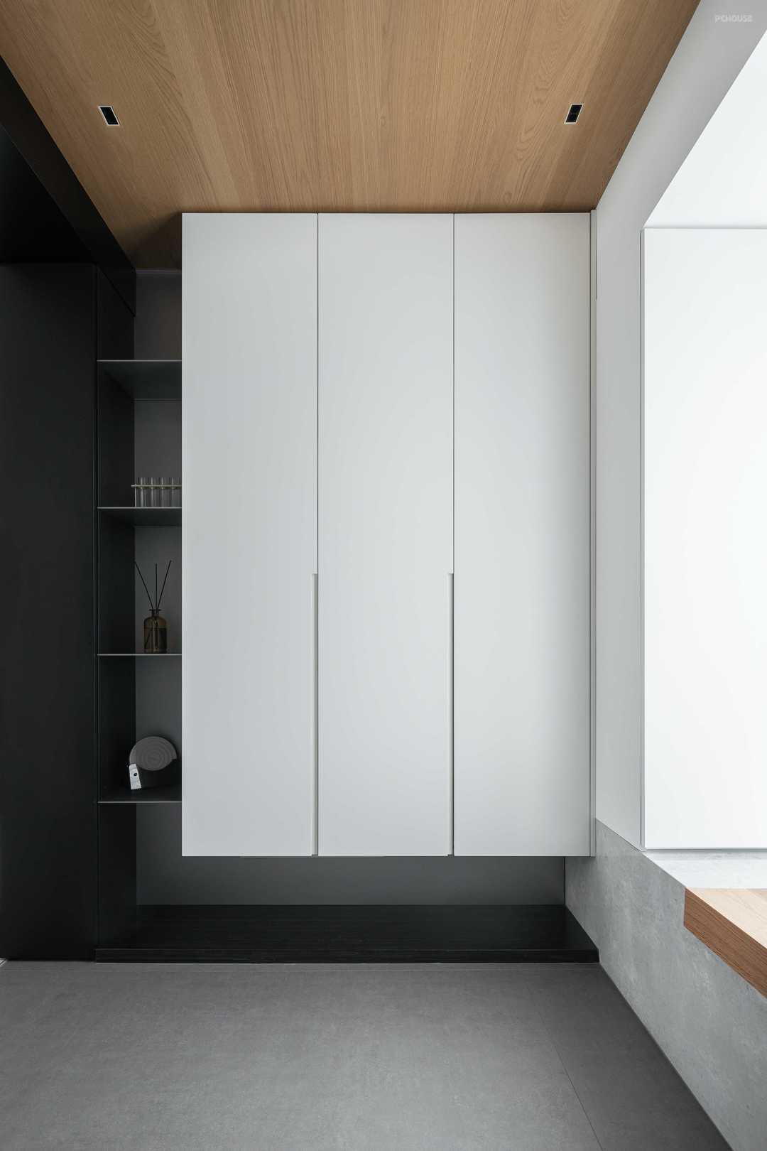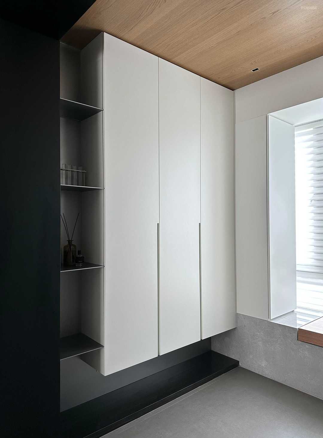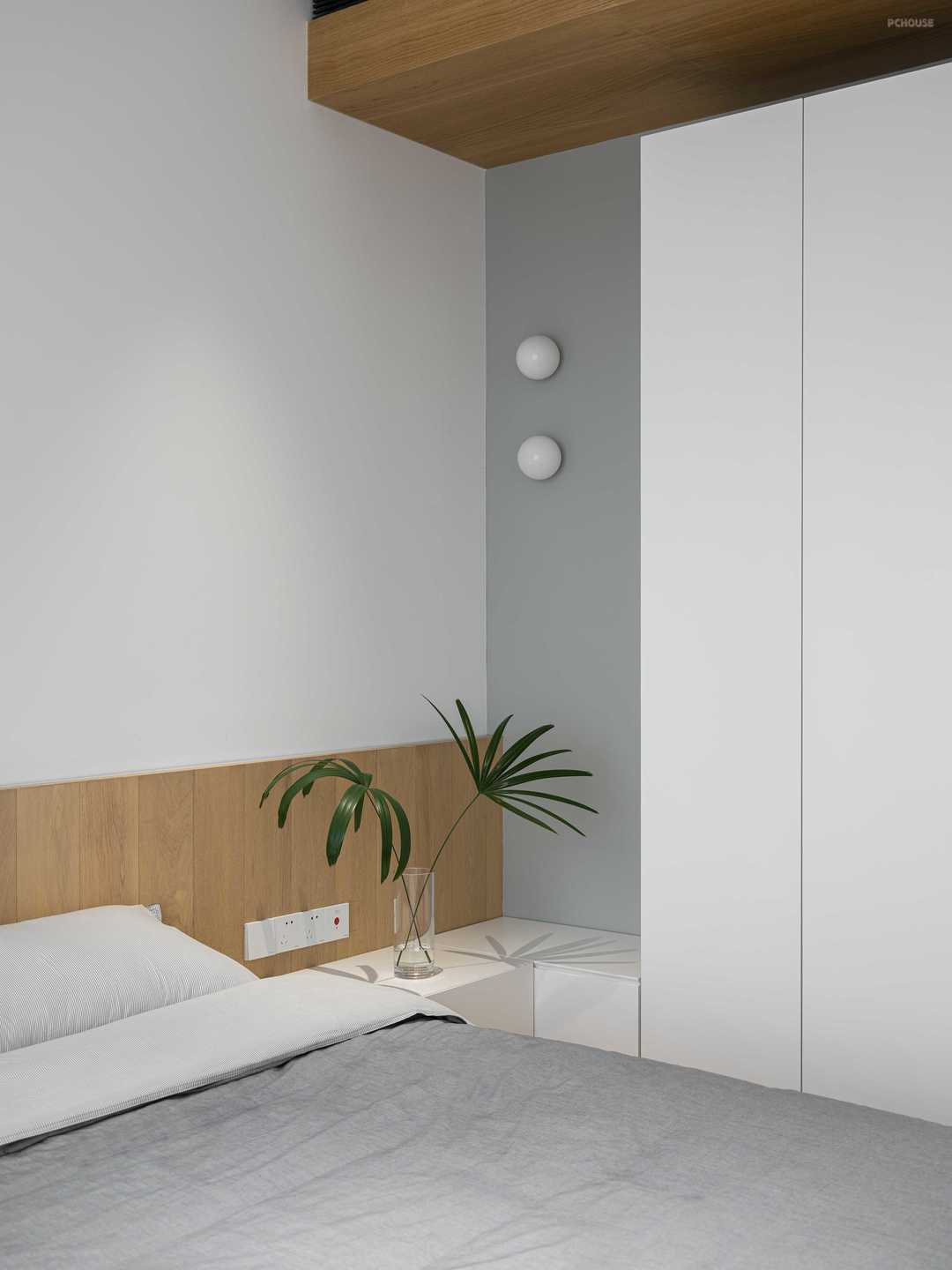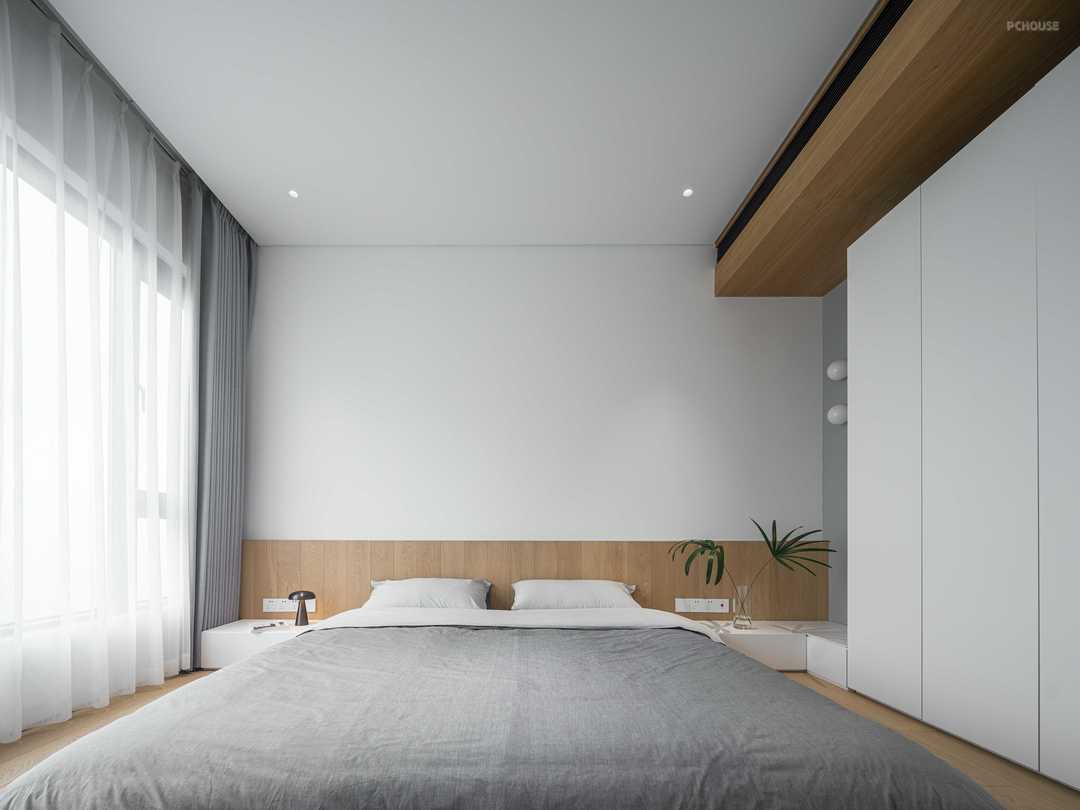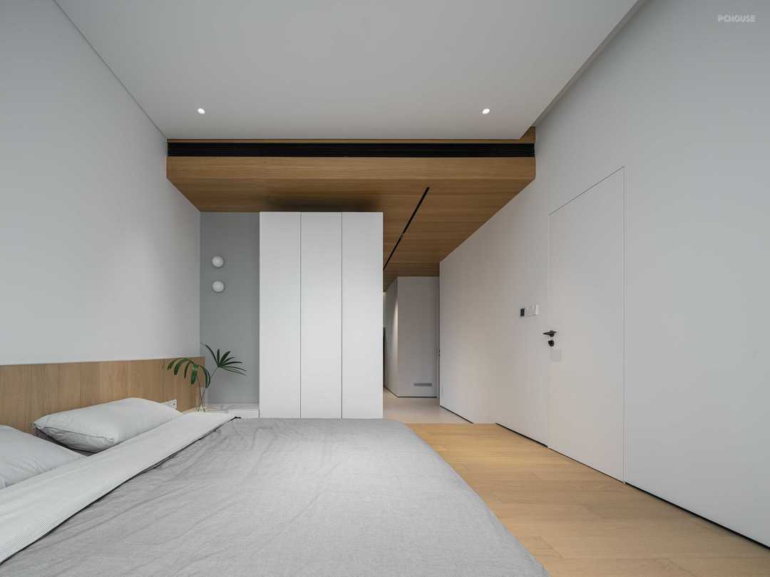 西面两间套房打通后,规划成主卧大套间,即便具有奢阔的大空间,但业主夫妇还是想要慵懒的包裹感。因此睡眠区保持简洁风格,白色基底上,木色与浅灰汇成柔和干净的空间语言。