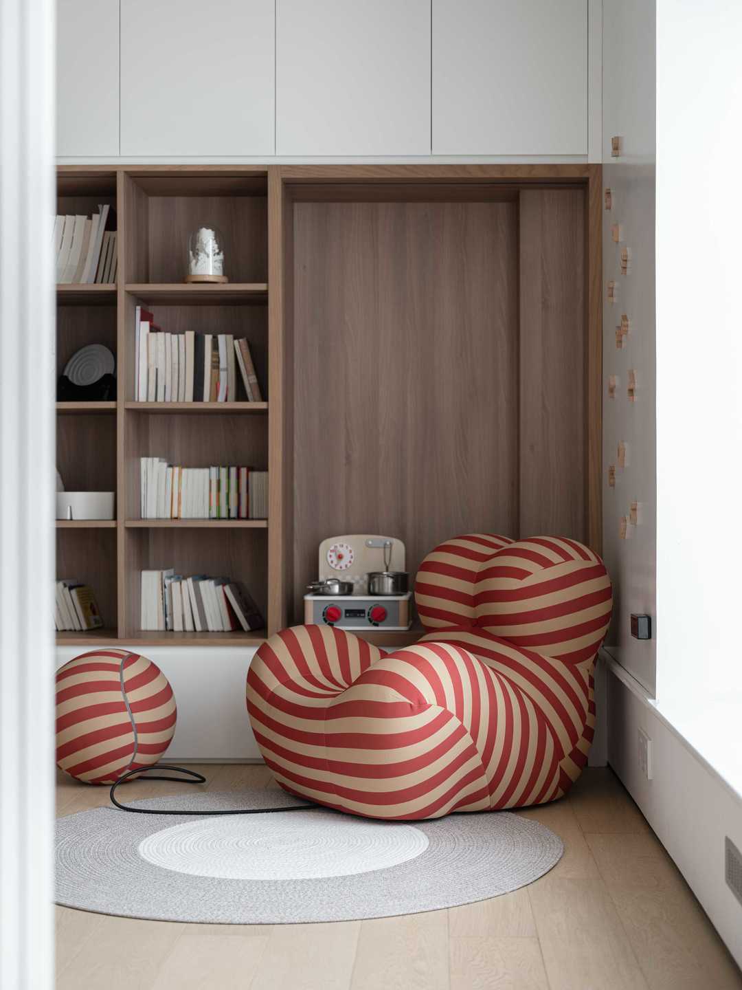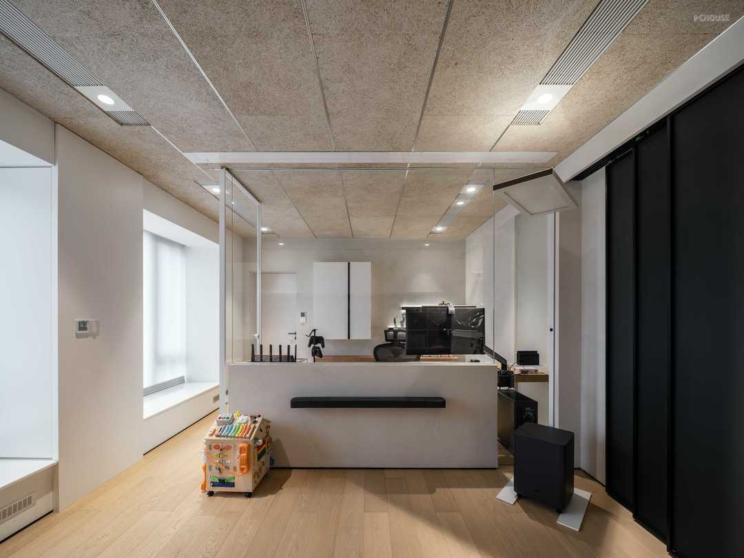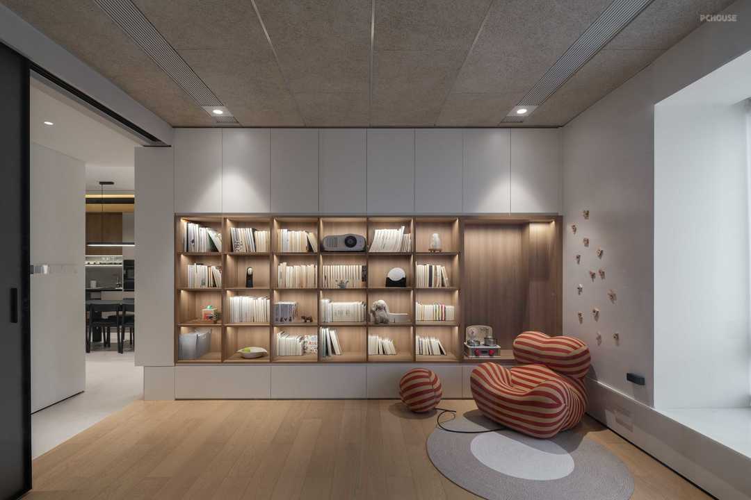 木地板满足孩子爬行的乐趣,亲子区也以适宜孩童的尺度打造,站起来隔着玻璃便能看到在书房工作的爸爸,让孩子既享受陪伴的乐趣,也懂得尊重与独立。整墙储物柜和磁吸墙,让玩具、书籍和小朋友的创作各得其所。移门则延展了空间的多重功能。