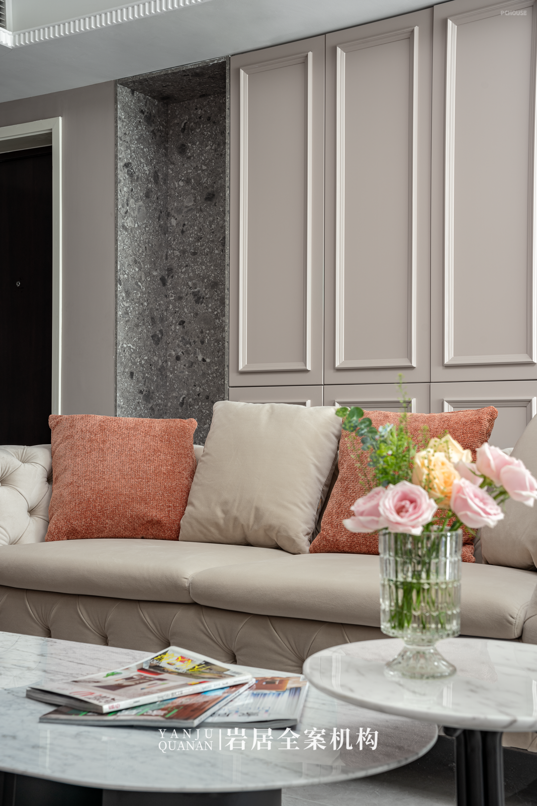 沙发背景墙别具一格,与鞋柜、西厨及生活阳台相连,形成流畅的空间布局。美式线条收纳柜的设计既增加了实用功能,又凸显了复古韵味,赋予空间一种典雅、舒适的氛围