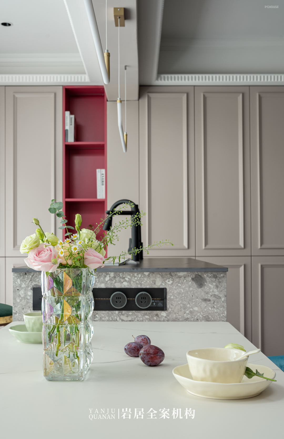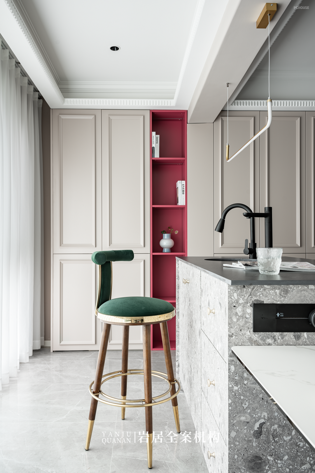 餐厅空间通透明亮,餐岛色彩以黑白为主,大理石纹路岩板装点的餐岛一体设计,兼具美观与实用性。复古餐椅的点缀,增添了一丝典雅与别致。