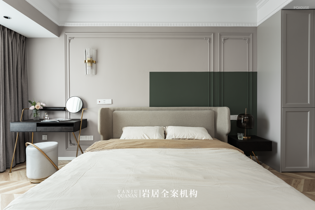 卧采用现代复古与现代混搭的设计风格,以复古墨绿色和现代奶油色为主,营造出柔和、温暖的视觉感受。