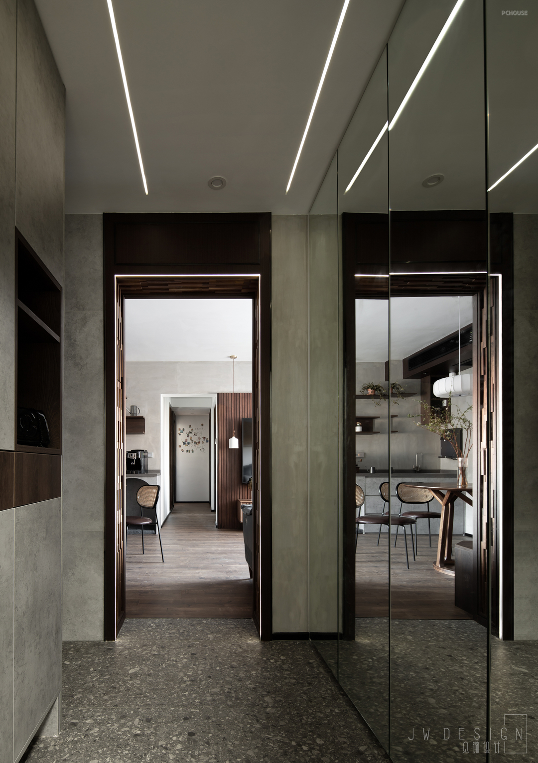 玄关加入了玻璃镜面,让空间更加通透。利落的线型灯拉长了空间的纵深感,搭配经典的水磨石,亘古的潮流。