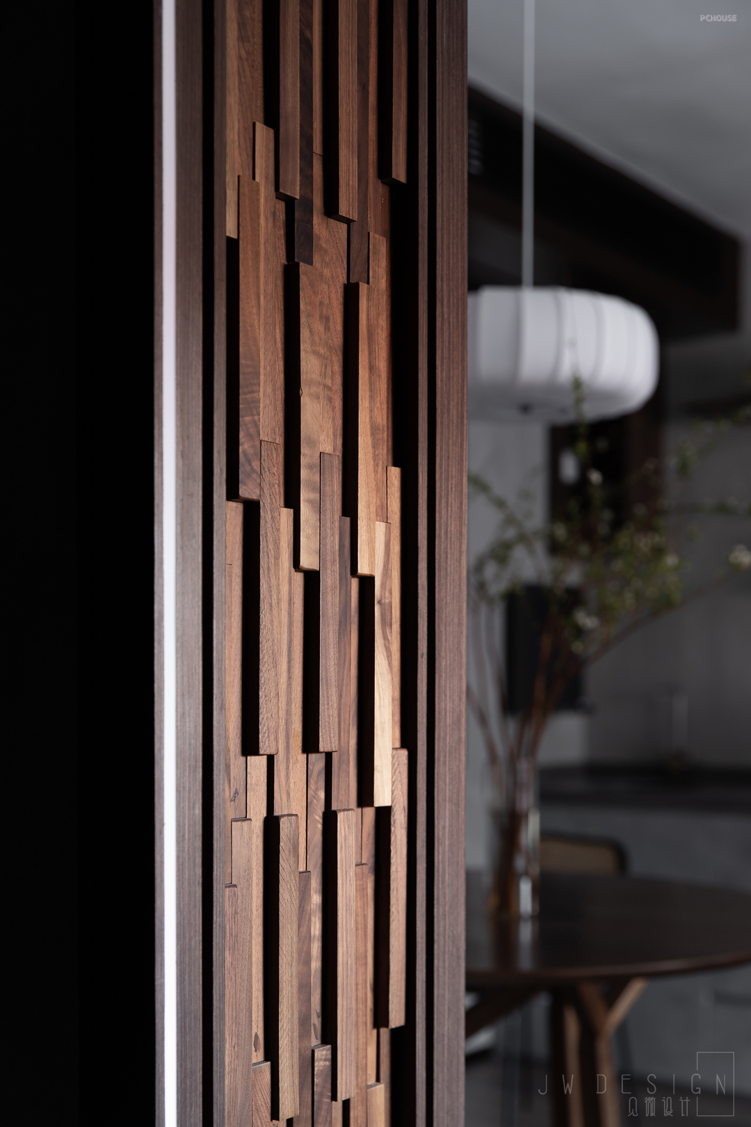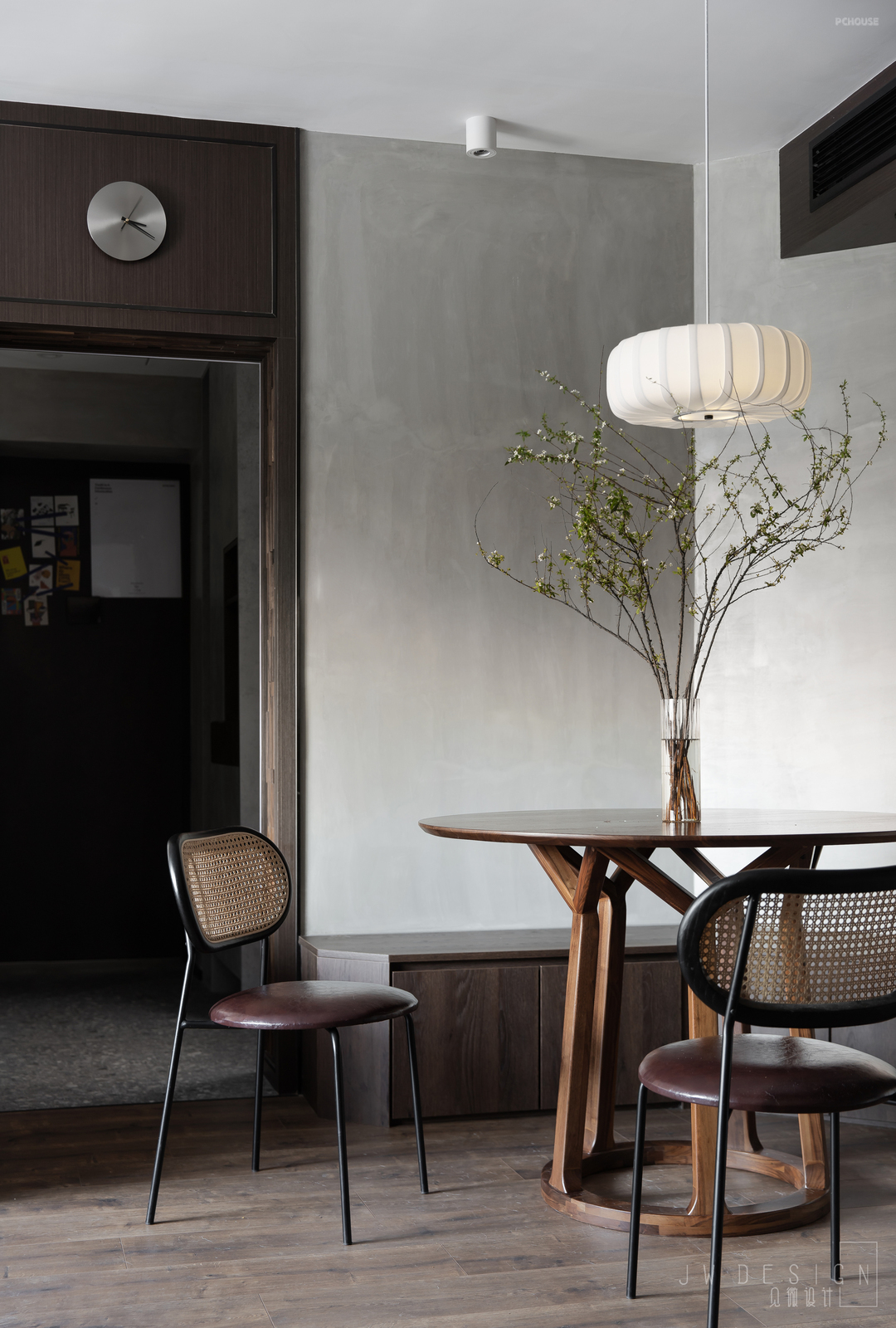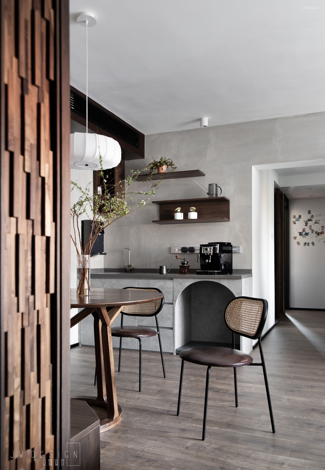 通过充满沧桑的胡桃木木质马赛克门洞,便进入了客餐厅。墙面灰调艺术漆使得整体空间更加纯粹,安静不张扬,具有微妙的视觉感知力。