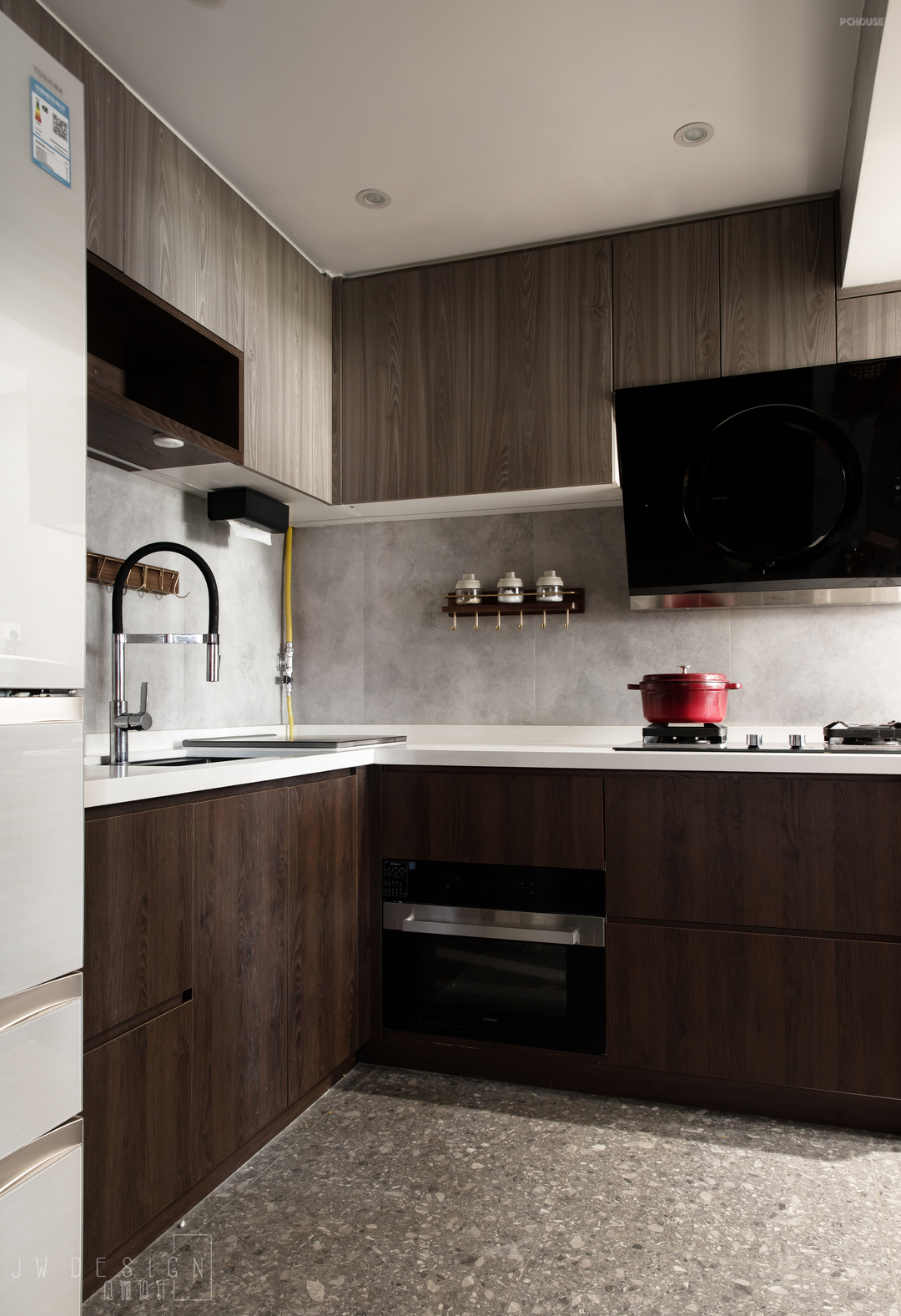2、拆掉厨房墙体,借用墙体厚度作为鞋柜的使用。厨房与餐厅因为楼层比较低都是承重结构不能改动,原有的窗洞做成折叠窗,除了延伸餐厅视觉空间也可作为传菜台互动使用。