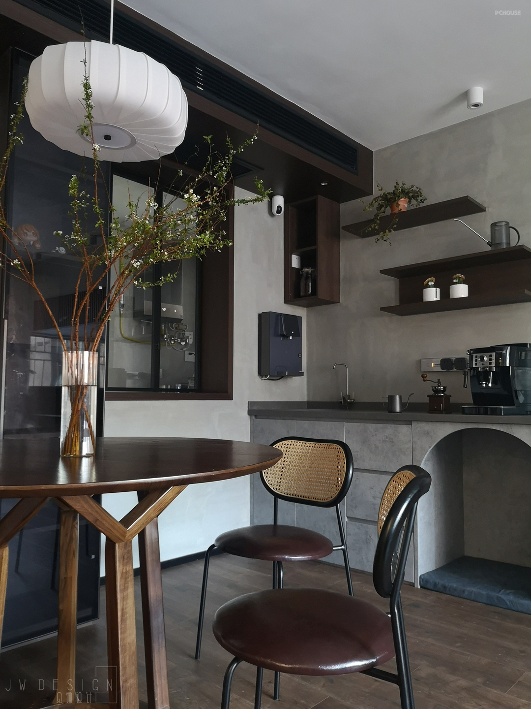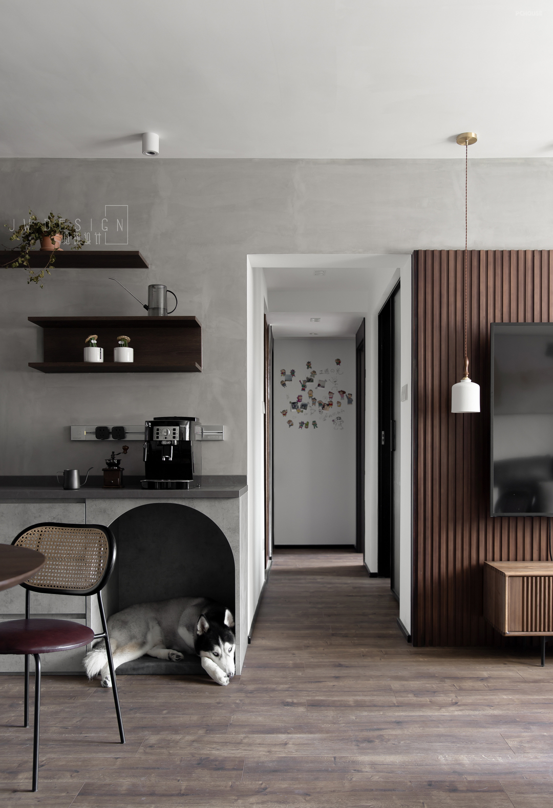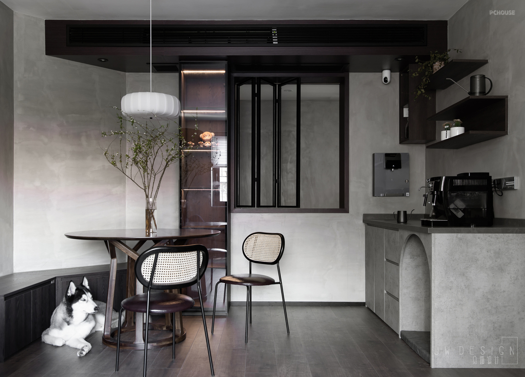 有仪式感的生活有时并不在于流于表面的精致,它是有灵魂的,不是片面,为舒适、为美学、为温暖。咖啡机的点缀、专门设置的狗窝、传统而现代的折叠窗,自然而言地凝聚着生活的痕迹。