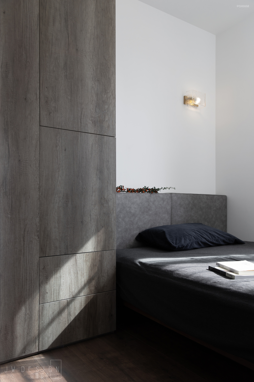 一侧到顶的鞋柜,开放格的设计,方便主人摆放,不同材质的融合,极简的同时温暖入心。