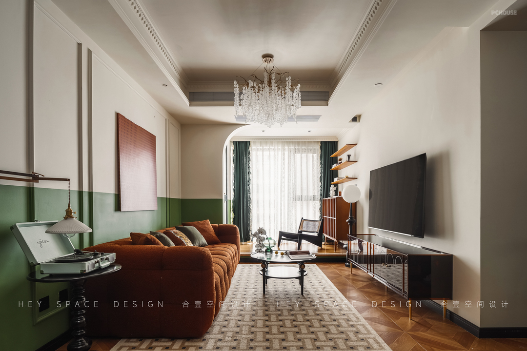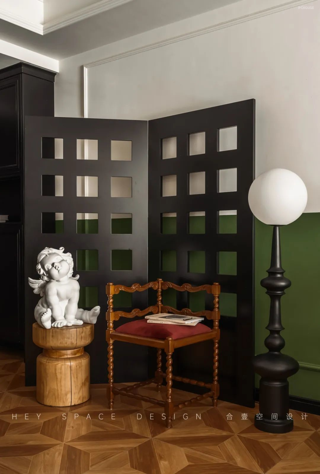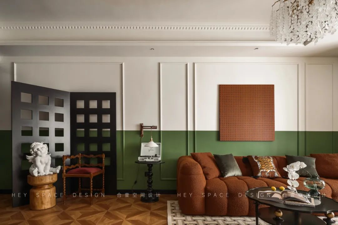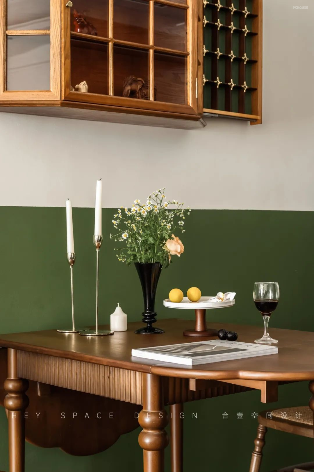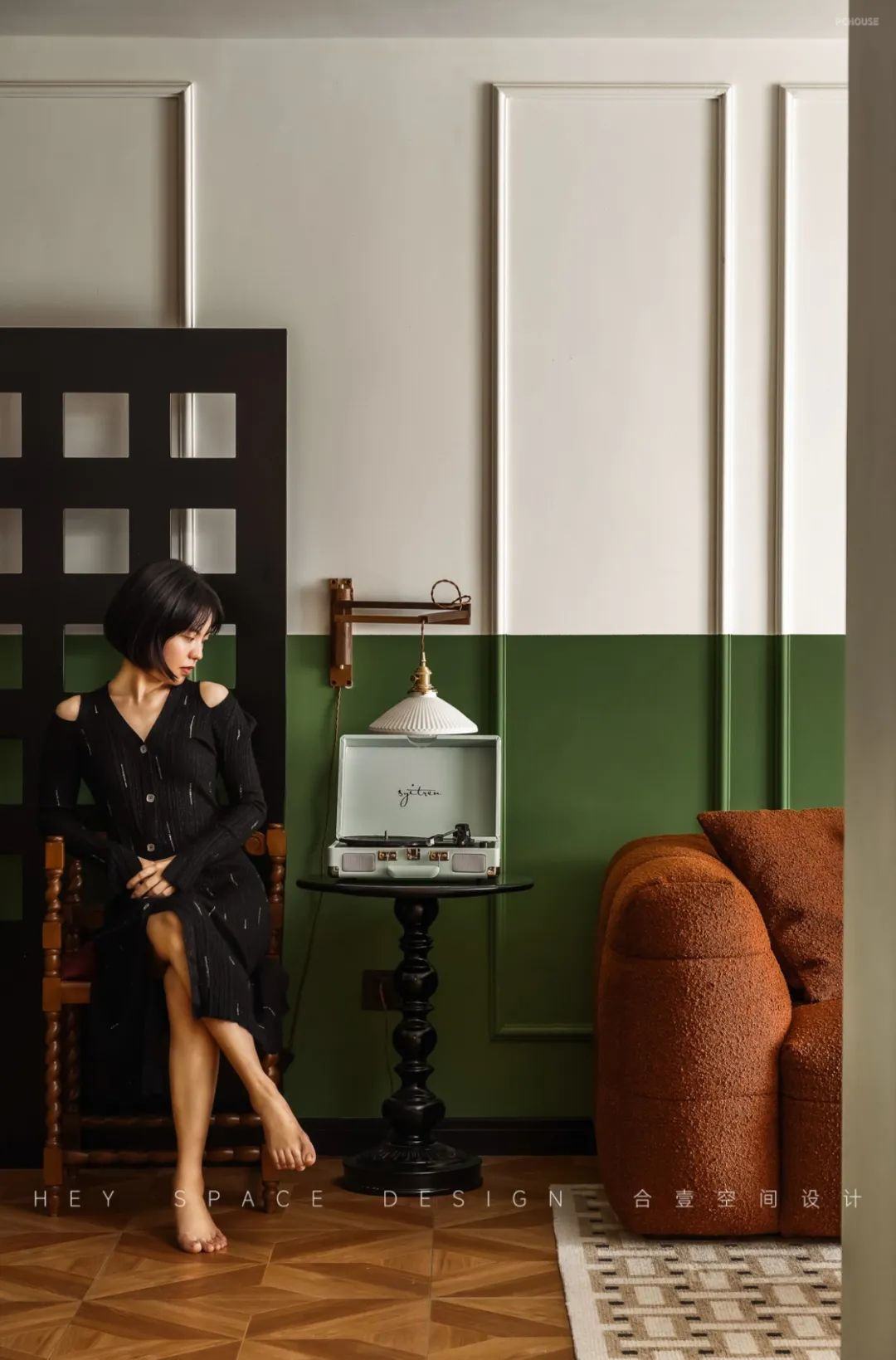 @合壹空间设计:石膏线条勾勒的空间,增加了浪漫而复古的格调。一半暖白,一半复古绿,深浅交织,不同于纯色的单调,也能给空间一点呼吸的松弛感。