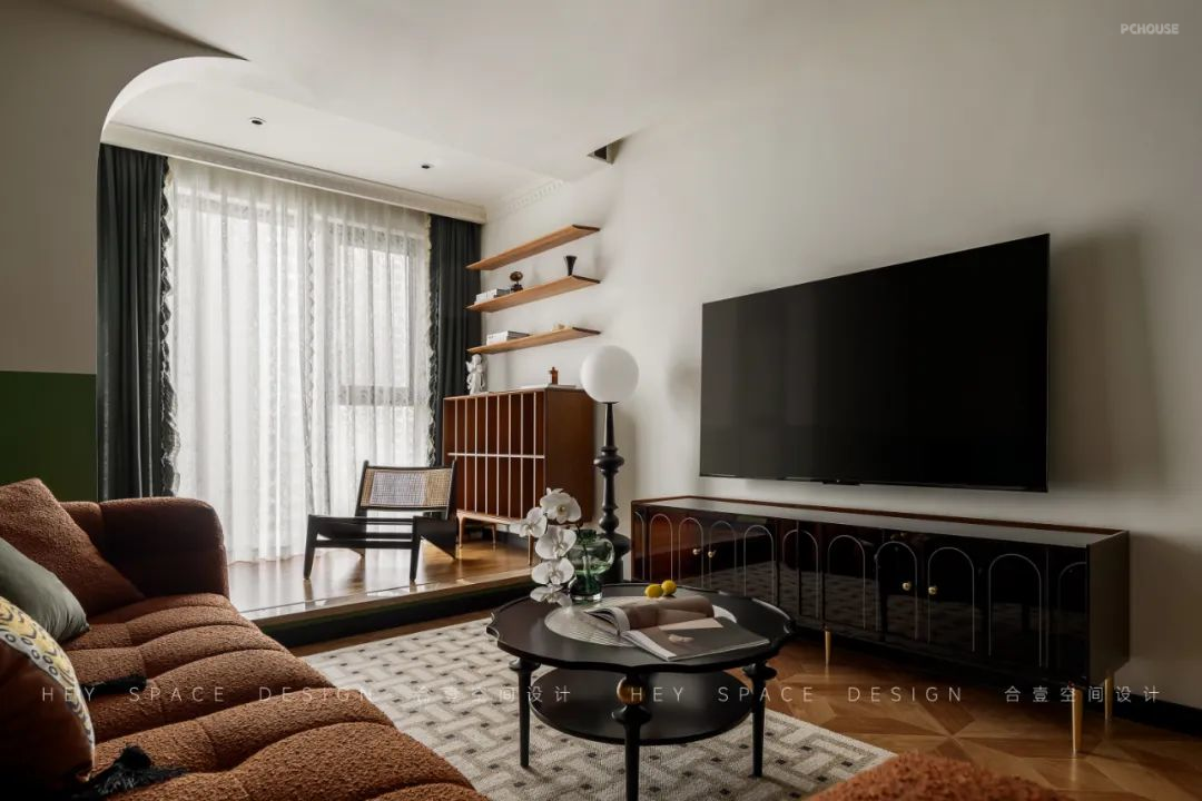 @合壹空间设计:咖色的温柔复古在这个空间里得到完美的呈现,搭配柔软的地毯,更具舒适感。花束摆件,是赋予生活的品质格调。