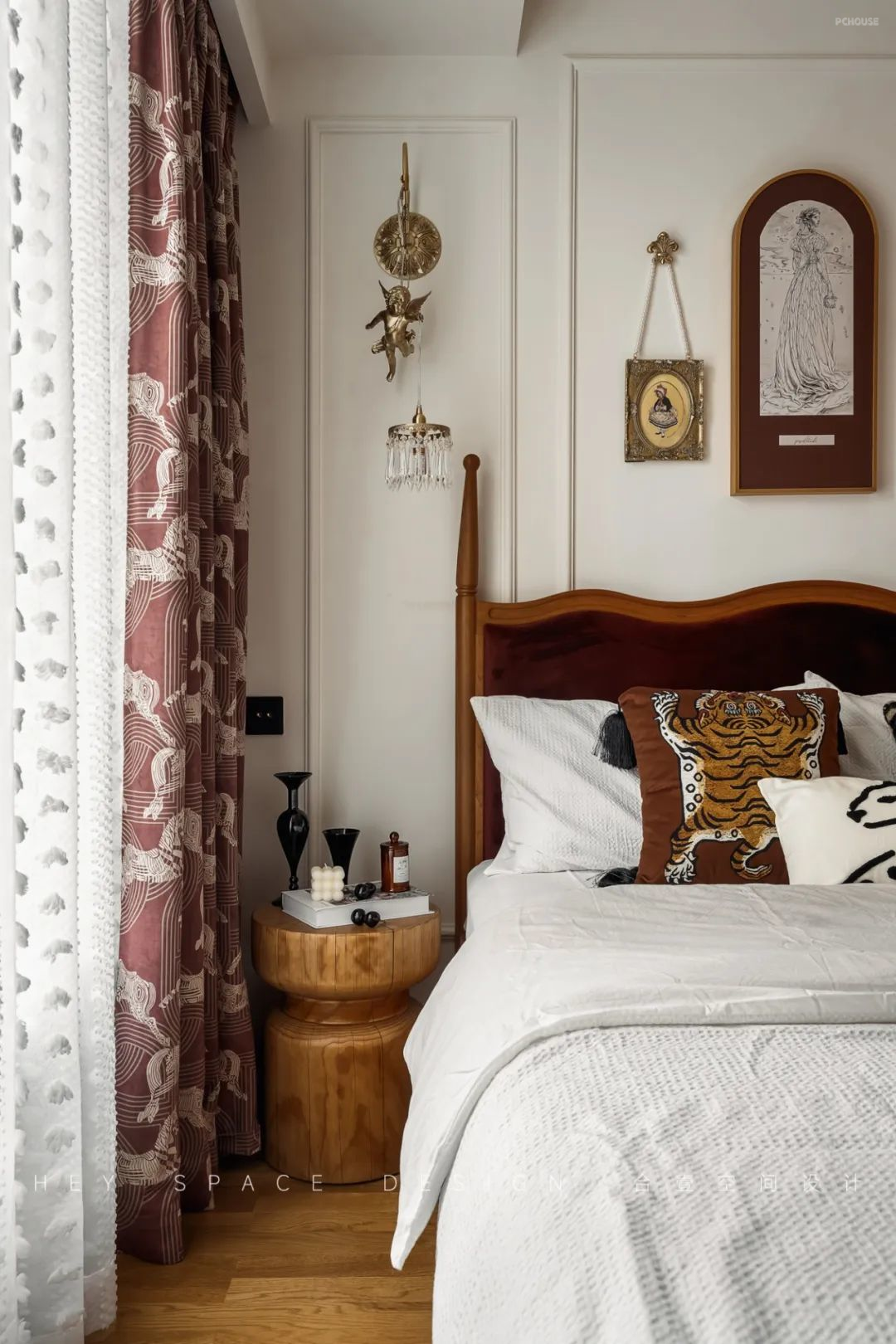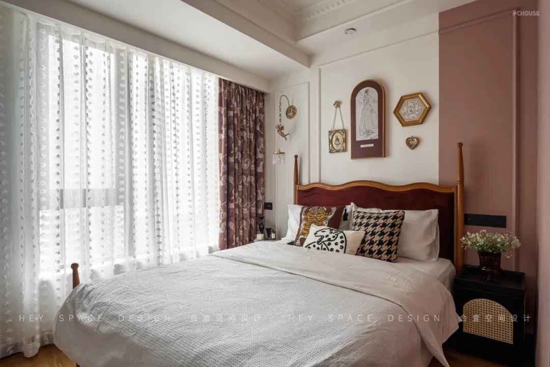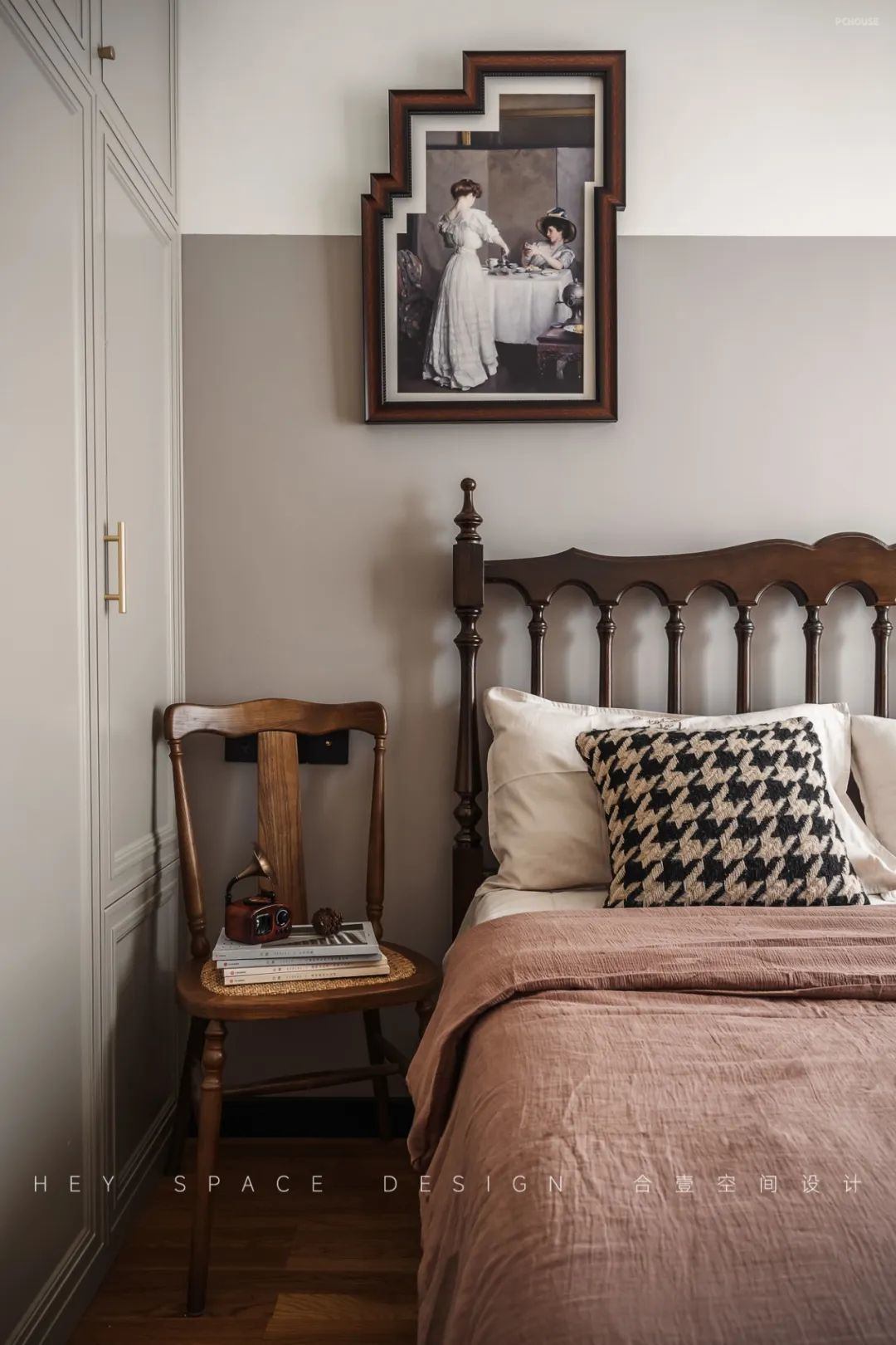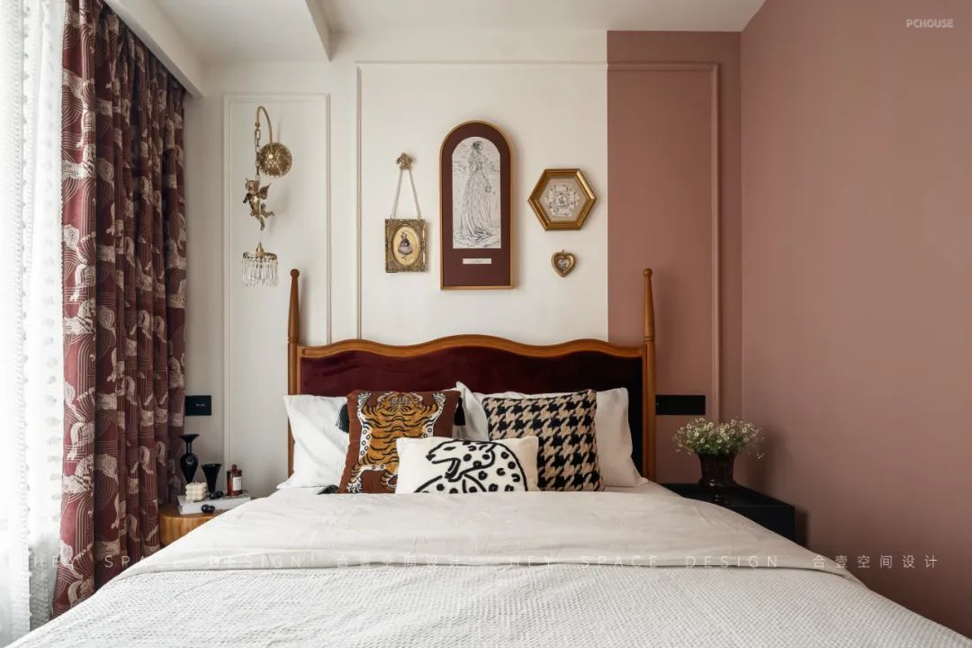 @合壹空间设计:主卧的配色更显甜美,粉白的搭配,更显温柔,背景墙用线条装饰,增添精致感,搭配中古风挂饰,让整个墙面更生动而复古。